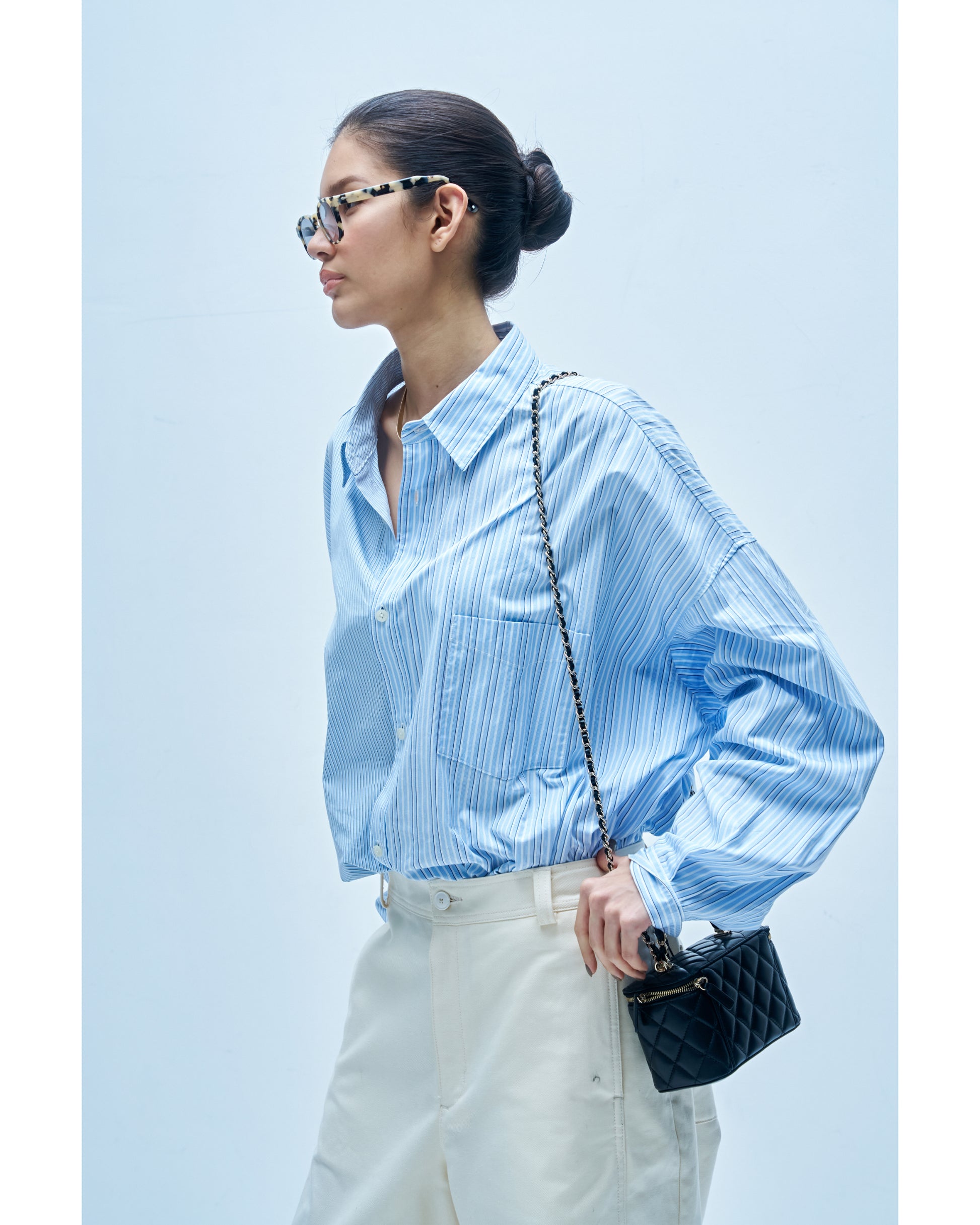 形状は若干のモディファイを加えたワイドな身幅に少し短めの丈のボックスシルエットで、ルーズなパンツからスキニーフィットまで多様なスタイリングをカバー。