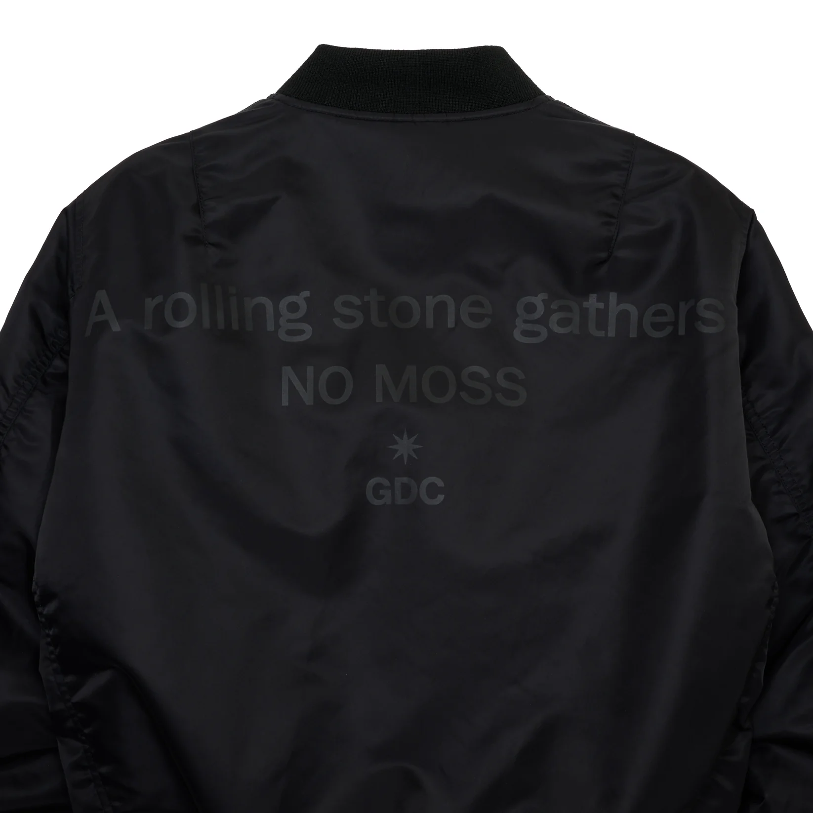 袖のユーティリティポケットやリブ仕様など、オリジナルの要素を丁寧に引き継ぎながら、GDCの解釈によるストリートなバランスへと仕上げている。熊谷の発案により、裏地にはフリース素材を採用し、リバーシブル仕様にアップデート。GDCだけの特別な一着となっている。背面には同色でさりげなく “A rolling gathers no moss” のメッセージを落とし込み、ミリタリーウェアにGDCらしい遊び心を添えている。