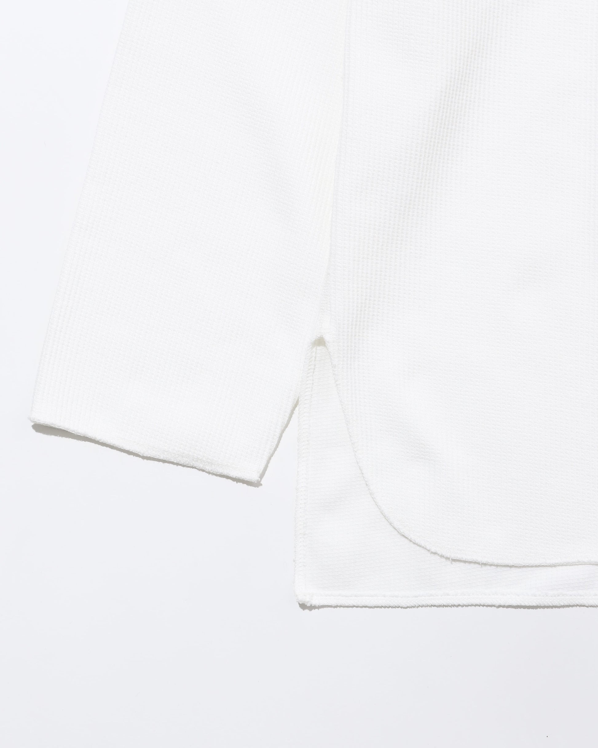 表面はワッフルのように凹凸がありますが、裏面はフラットに編まれています。そのため着用時の着心地が良く、着用後の伸びやへたりを軽減し、型崩れの少ない生地に仕上げています。内側に微細な溝を持つ異形断面と丸断面の単繊維をランダムに配列し、さらにねじれを加え繊維間に極細の隙間をつくり優れた吸水性と拡散性、ドライ感を生み出すポリエステル糸と硬く毛羽を取り除いた綿を合わせて使用することで、上品な光沢が表に出て、なおかつ吸水速乾性の高機能を持ち合わせた素材です。洗い加工をしています。サイズに個体差は若干ありますが、通常の洗濯で縮みはほとんど出ません。