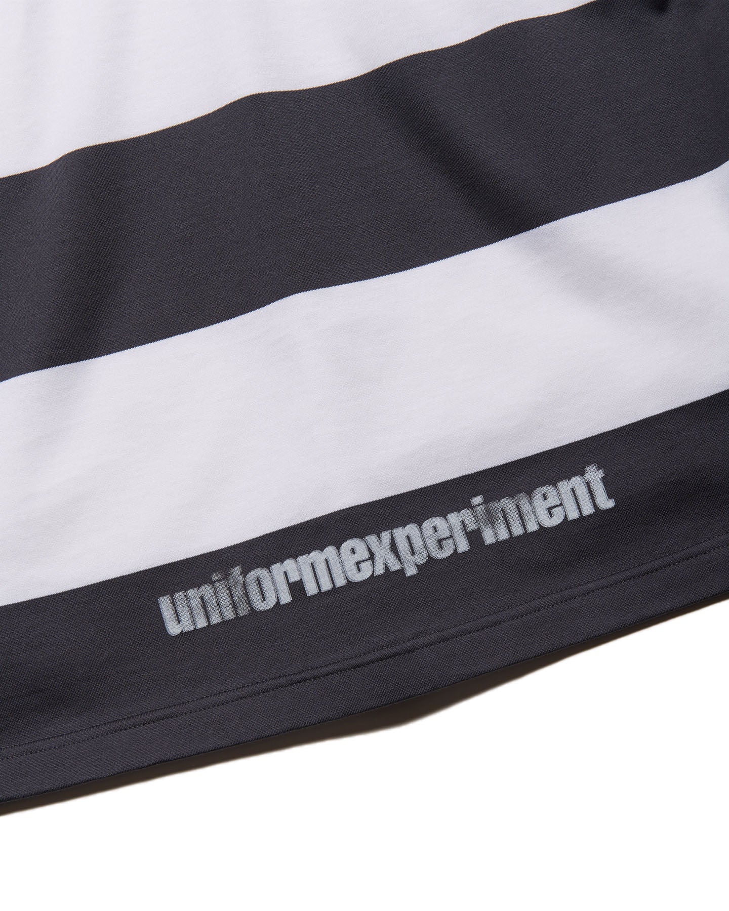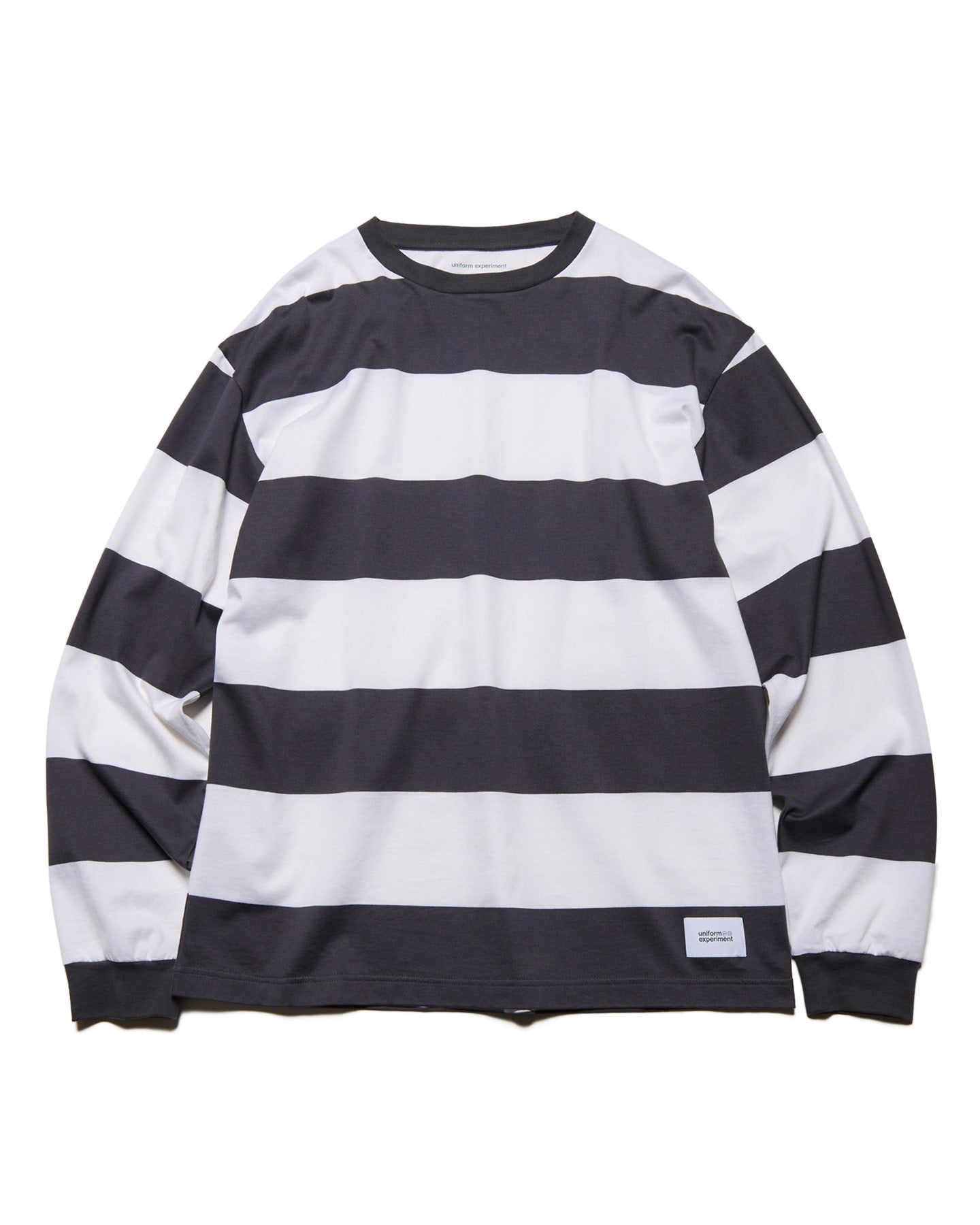 従来の天竺素材よりハイゲージで編み上げ、シルケット加工でクリアな生地感に仕上げたオリジナルボーダーのロングスリーブT。背面下部にはuniform experimentのグラデーションロゴをプリントしています。