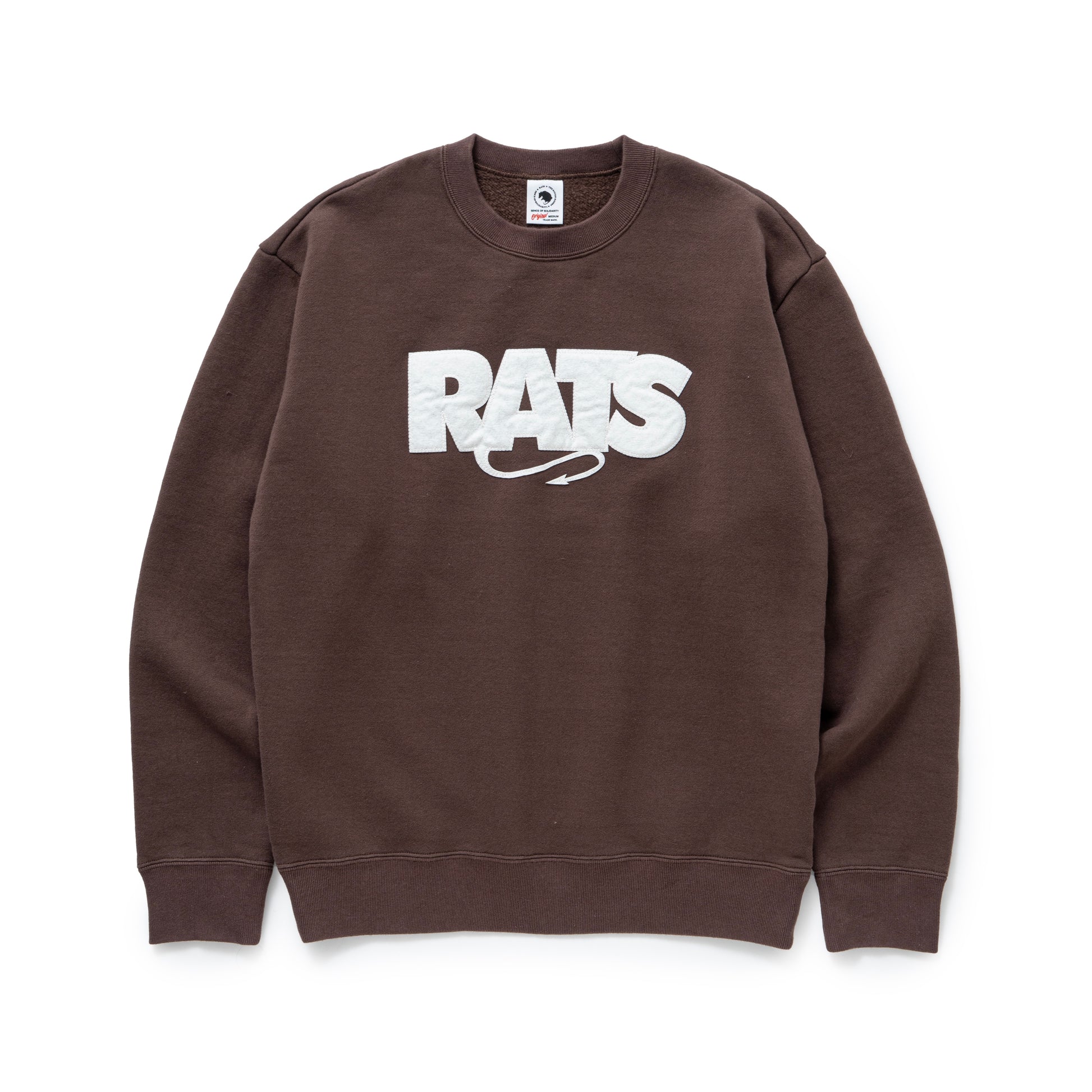 13oz.のコットン裏毛を起毛させた素材を使用したクルーネックスウェットシャツ。フロントにボックス型RATSロゴをフェルトパッチを配置、フェルト縁は千鳥刺繍で表現したデザイン。製品にてワンウォッシュ済み。レギュラーフィットシルエット。