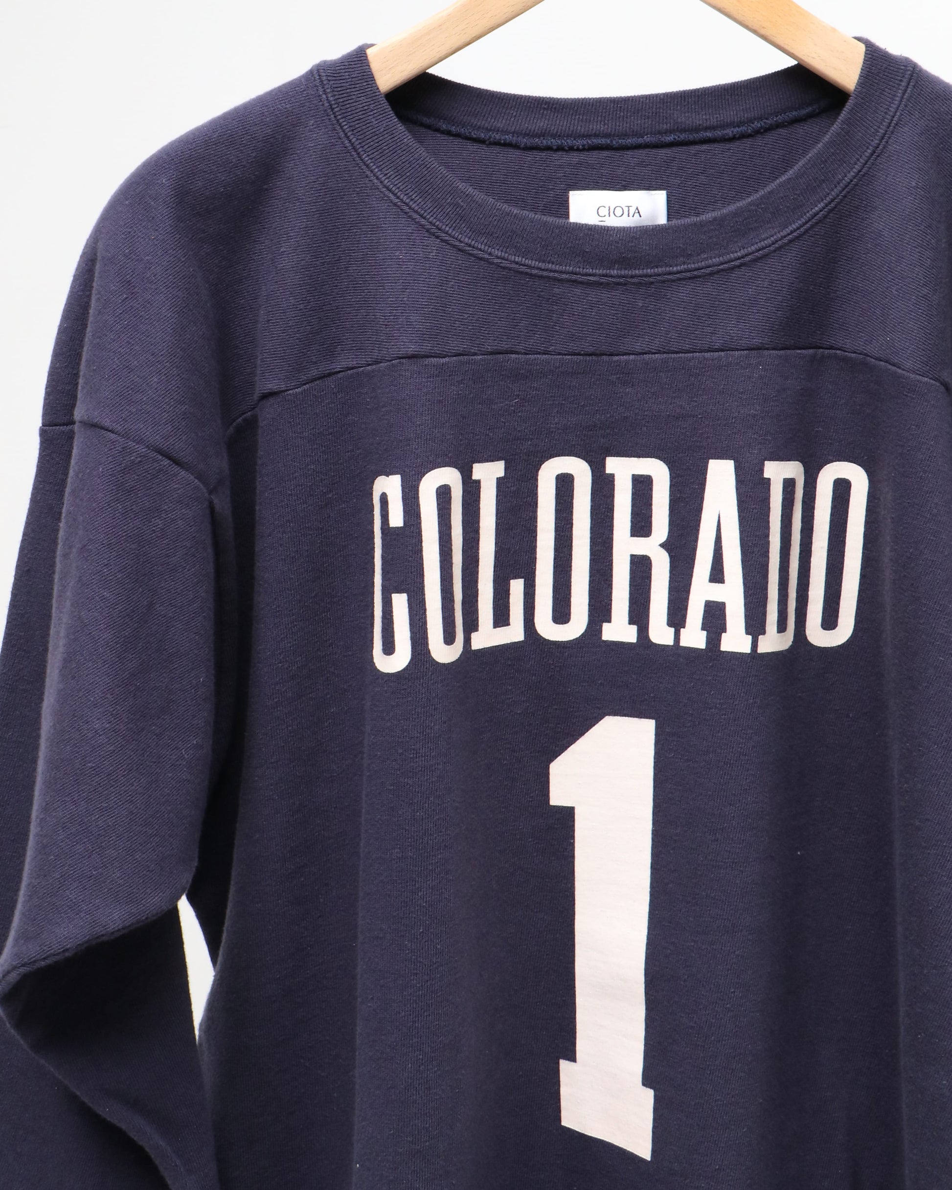 スビンコットンの中でもとりわけ希少性の高い“スビン ゴールド”を使ってフットボールTシャツを作りました。デザインは1970年代のヴィンテージをサンプリグしています。スビンゴールドの特性である、シルクのような光沢とカシミヤのような肌触りを最大限に活かすならば、毛羽立ちを抑えるコーミング加工を施すのが一般的ですが、こちらはナチュラルな風合いを残したカード糸。太さは12番手で、スラブ糸(フシのある糸)を使用することで、ラフな表情に仕上げました。それでもスビンコットンの滑らかなタッチは十分に体感いただけます。
