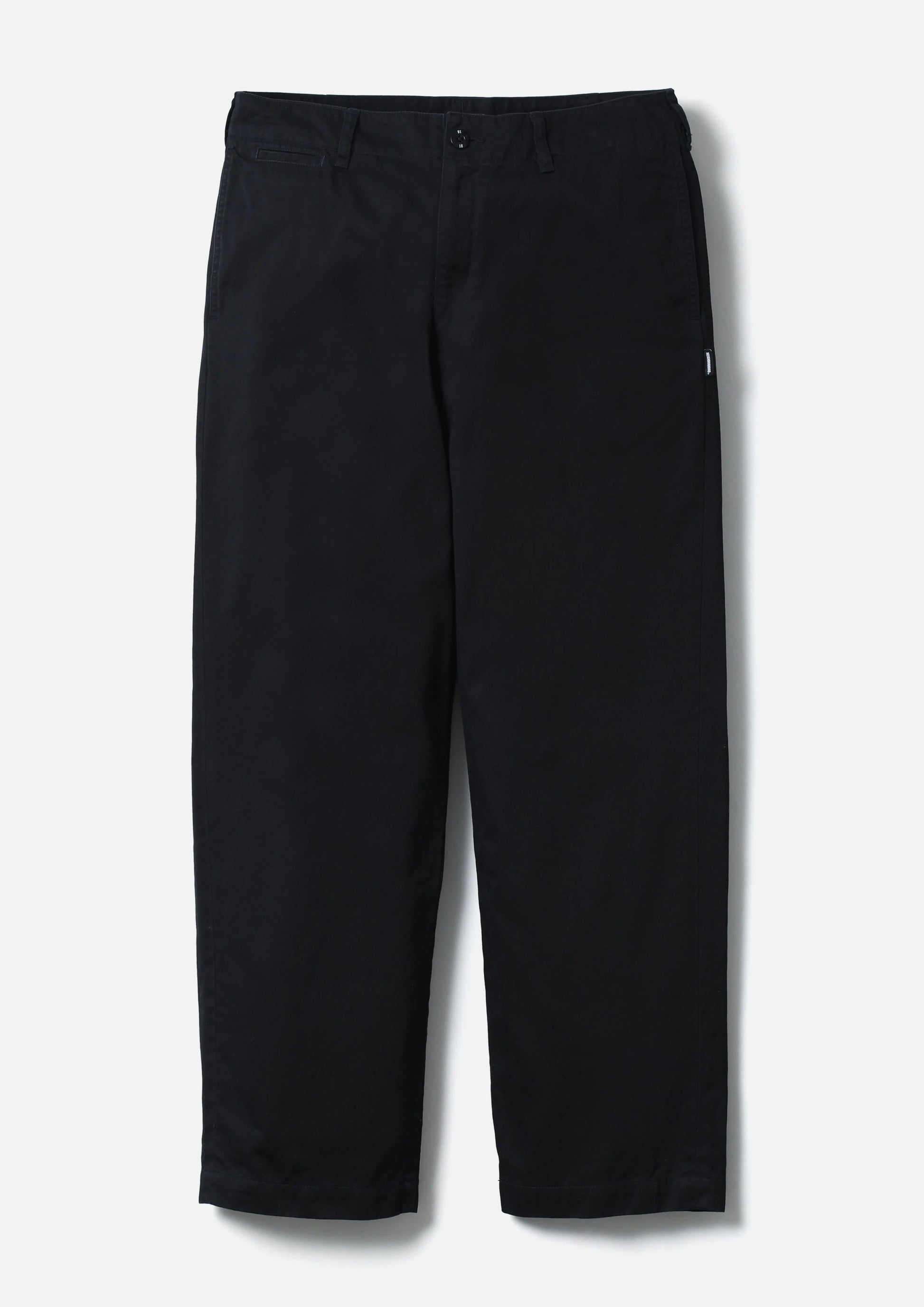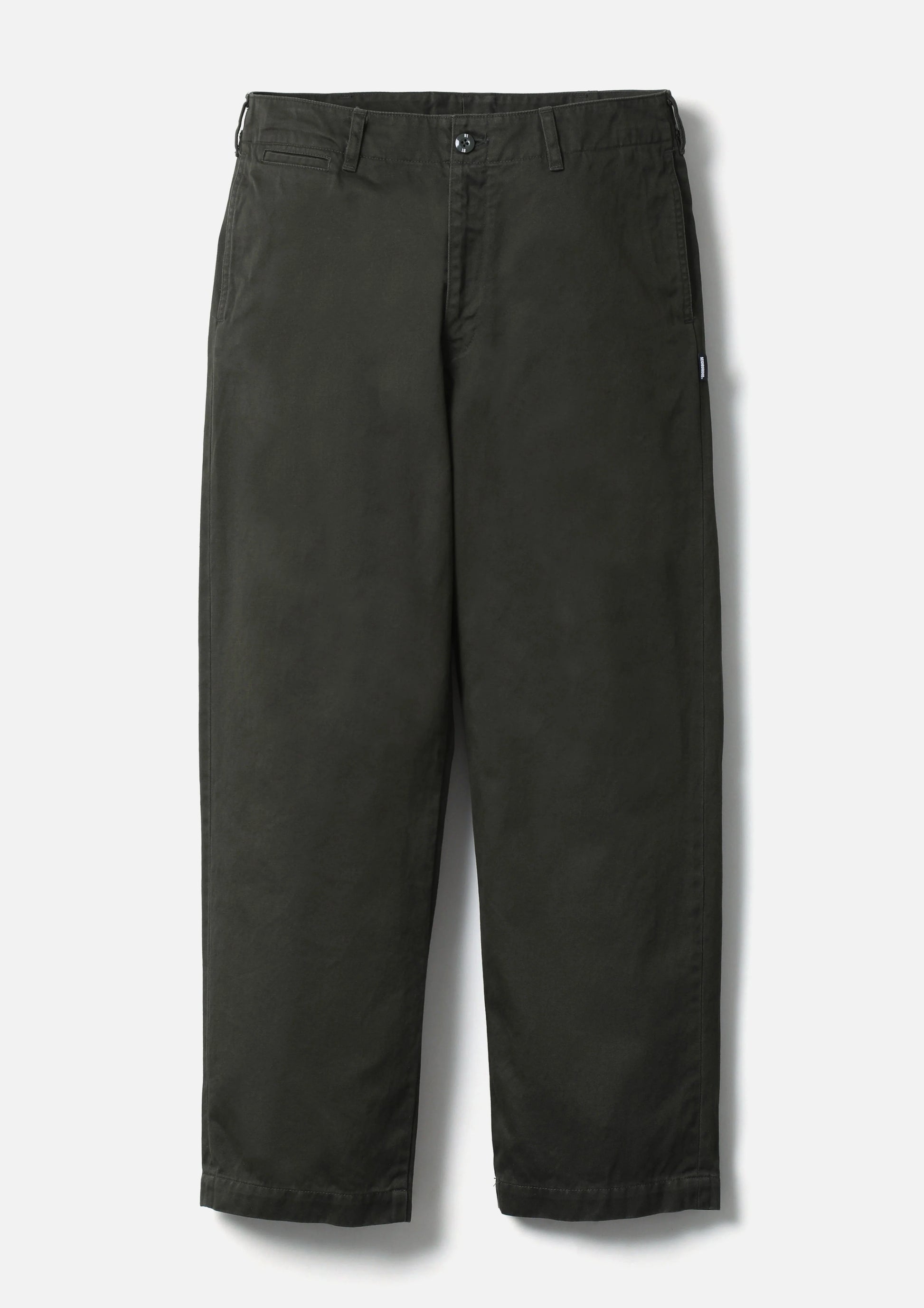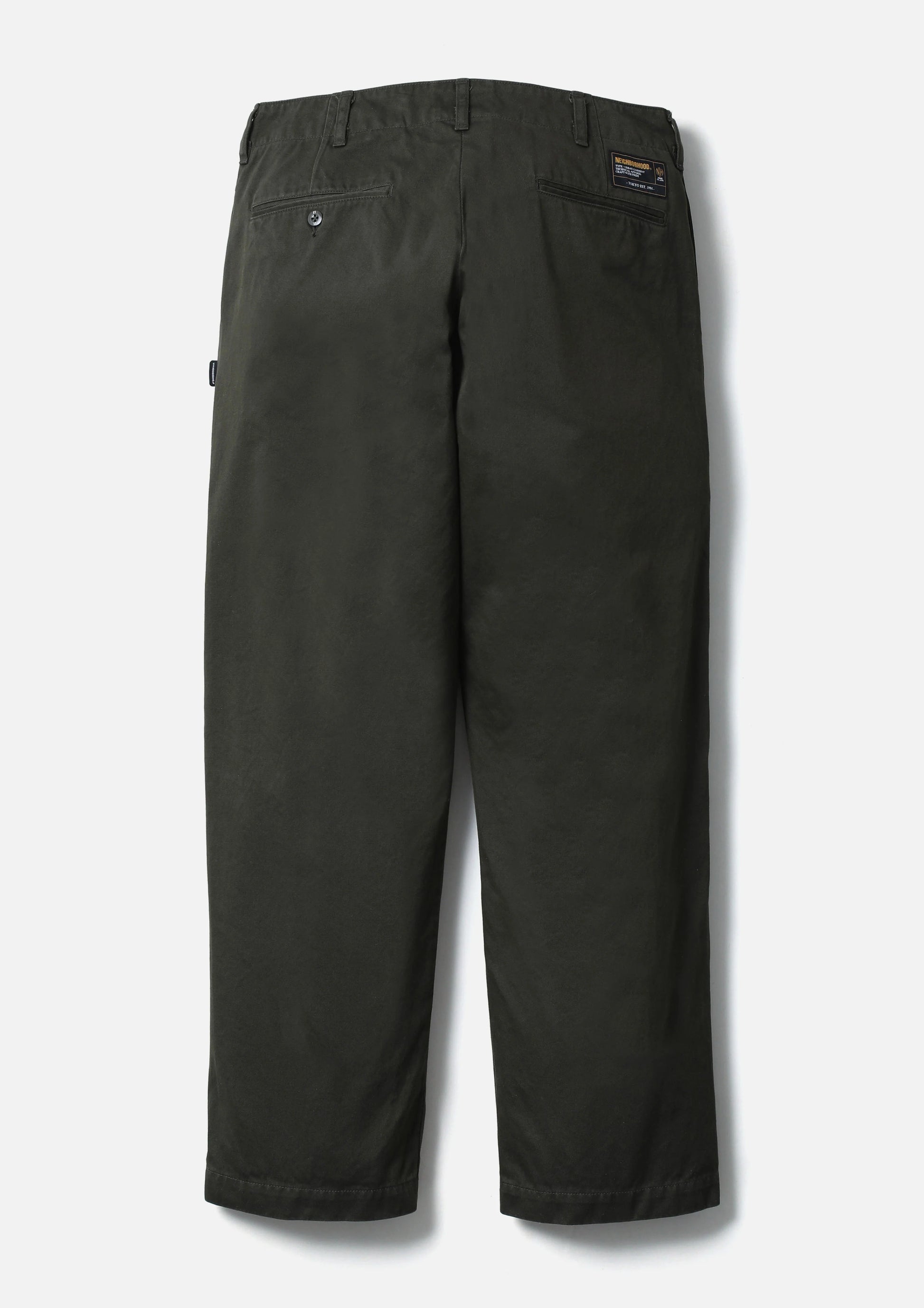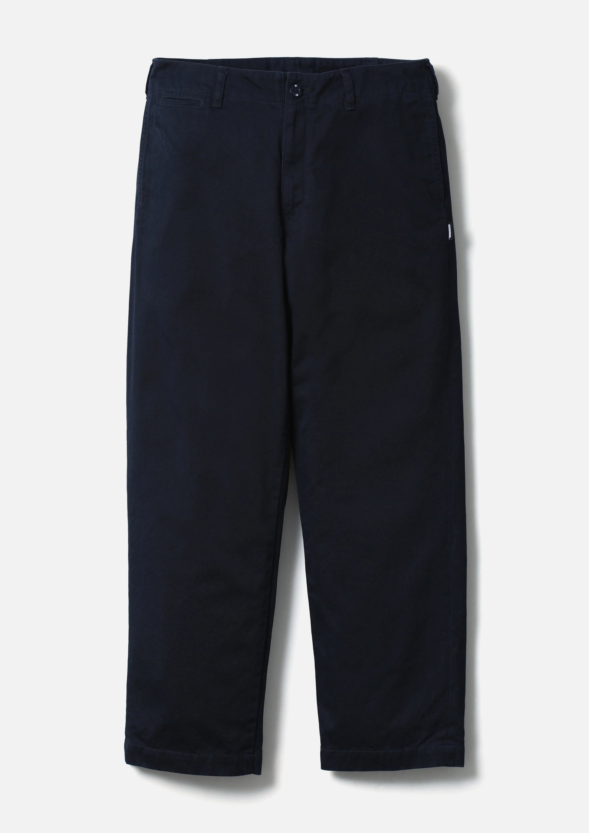 チノクロスの一種である高密度ウエストポイント生地を使用し、バイオストーンウォッシュ加工を施したチノパンツ。通常のチノとは異なり2本の糸で織り上げるため、よりタフで光沢感のある仕上がりが特徴。オリジナルの4つ穴ボタンとフロントファスナーを採用。ヒップポケット上部にネームタグ、サイドシームにピスネームを付属。ゆとりのあるストレートシルエット。