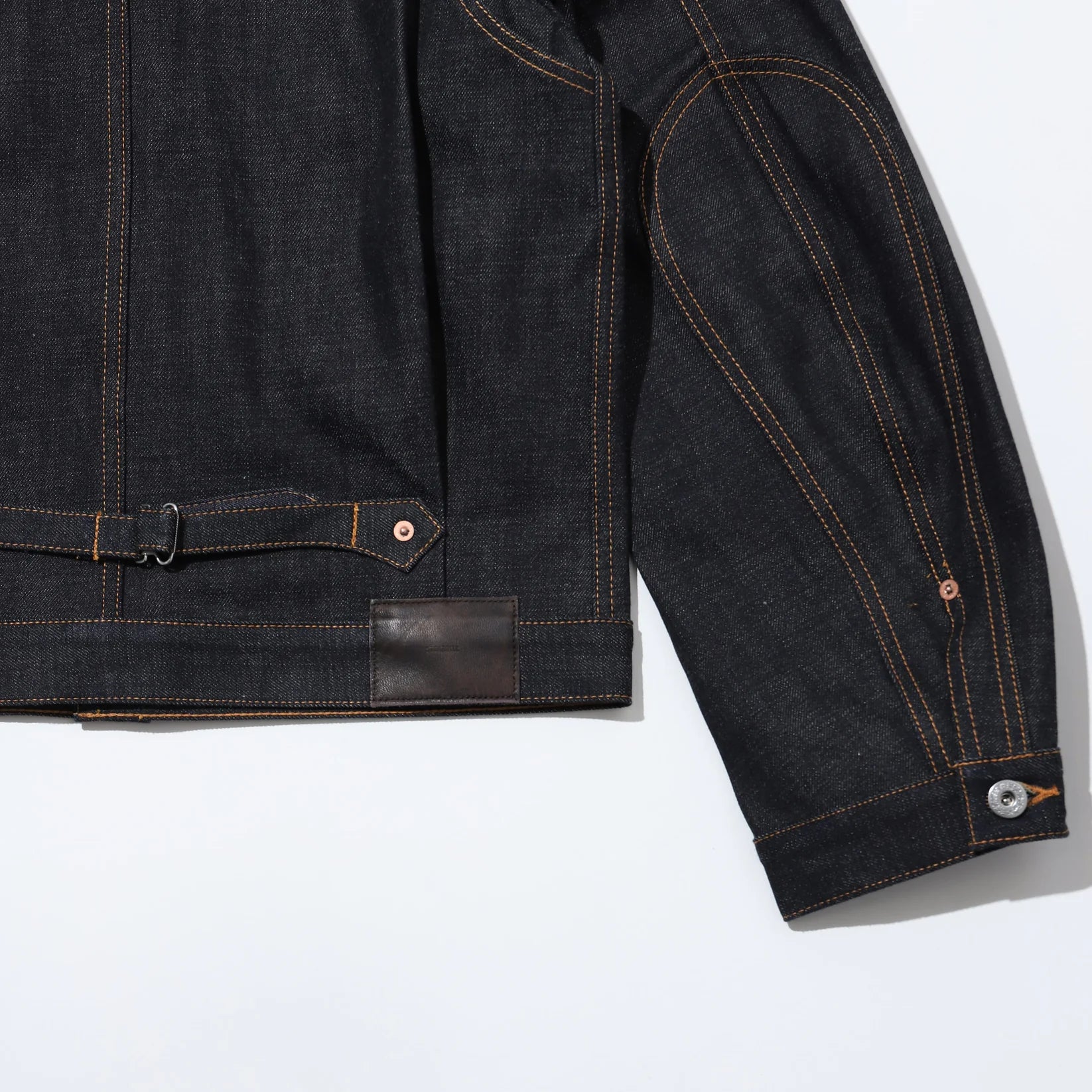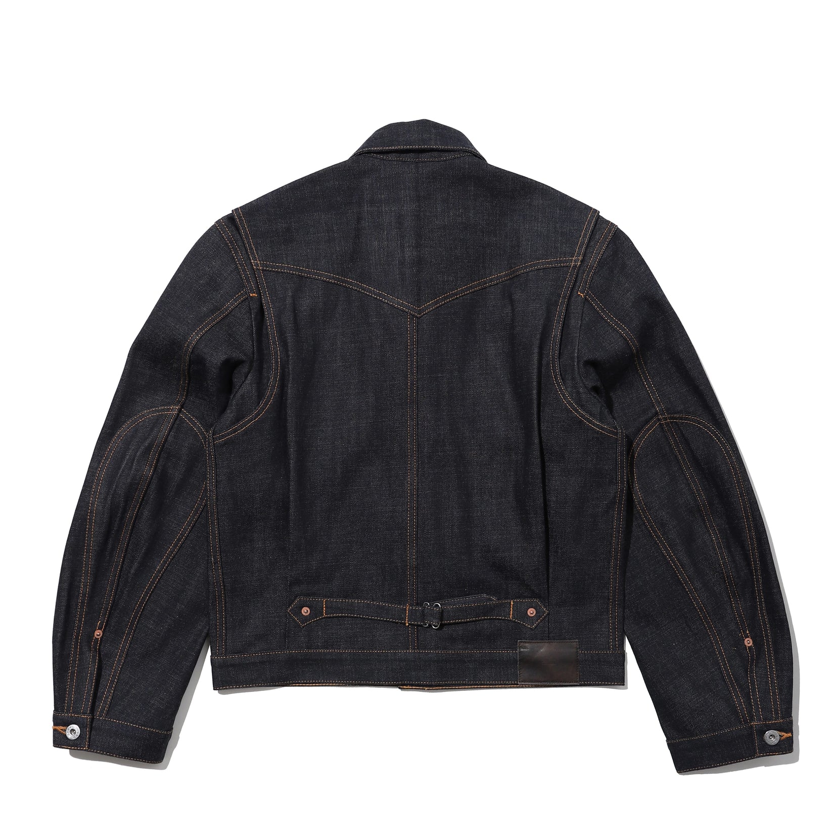 507XXをベースに再構築したデニムジャケットは、トリプルプリーツやオーバルステッチ、象徴的なワイングラス型のポケットを内外両面に配しています。袖口から伸びるエルボーパッチに加え、テーラードスリーブがインパクトのあるシルエットを演出します。