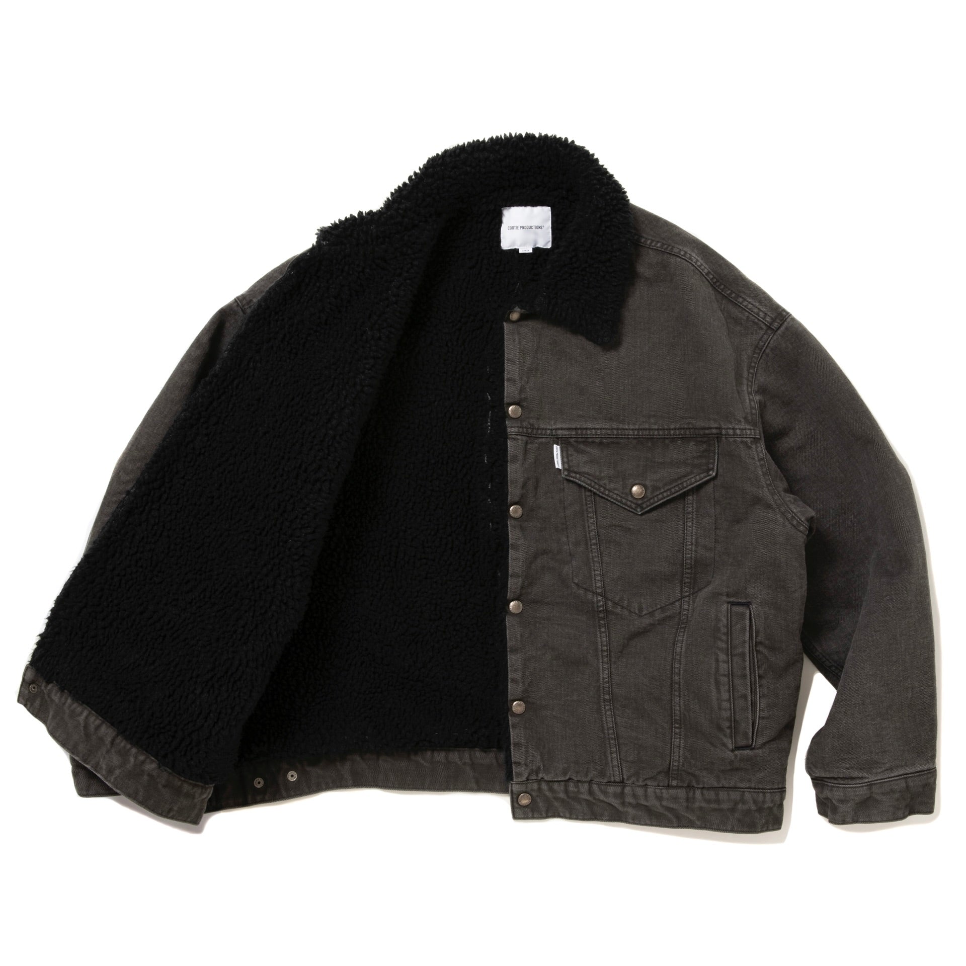 縦横で染色方法が異なるカラーデニムを使用。製品 Wash 加工を施すことによりナチュラルなムラ感のある表情を持つ。身頃裏にボア、袖裏には袖通しを考慮したキルトを使用。ワイドシルエット。