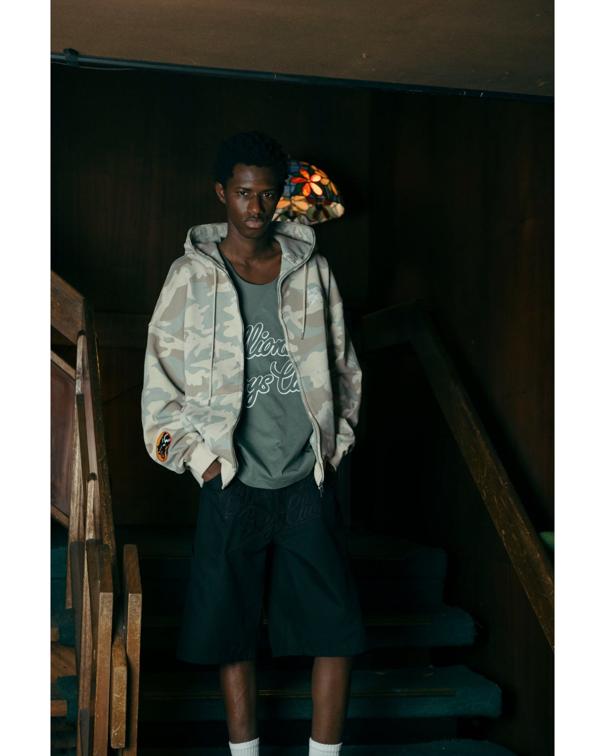 胸元にはさりげないロゴプリント、袖にはワッペンディテールを配置し、シンプルながらもBBCらしい遊び心をプラスしています。