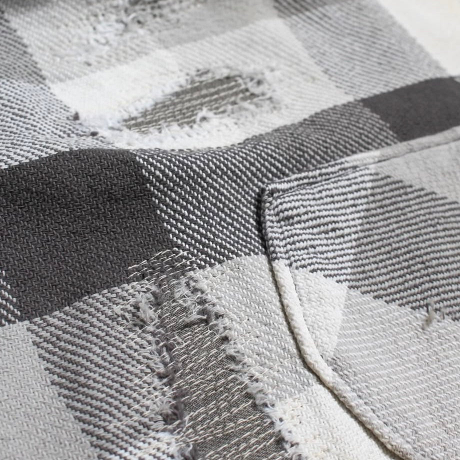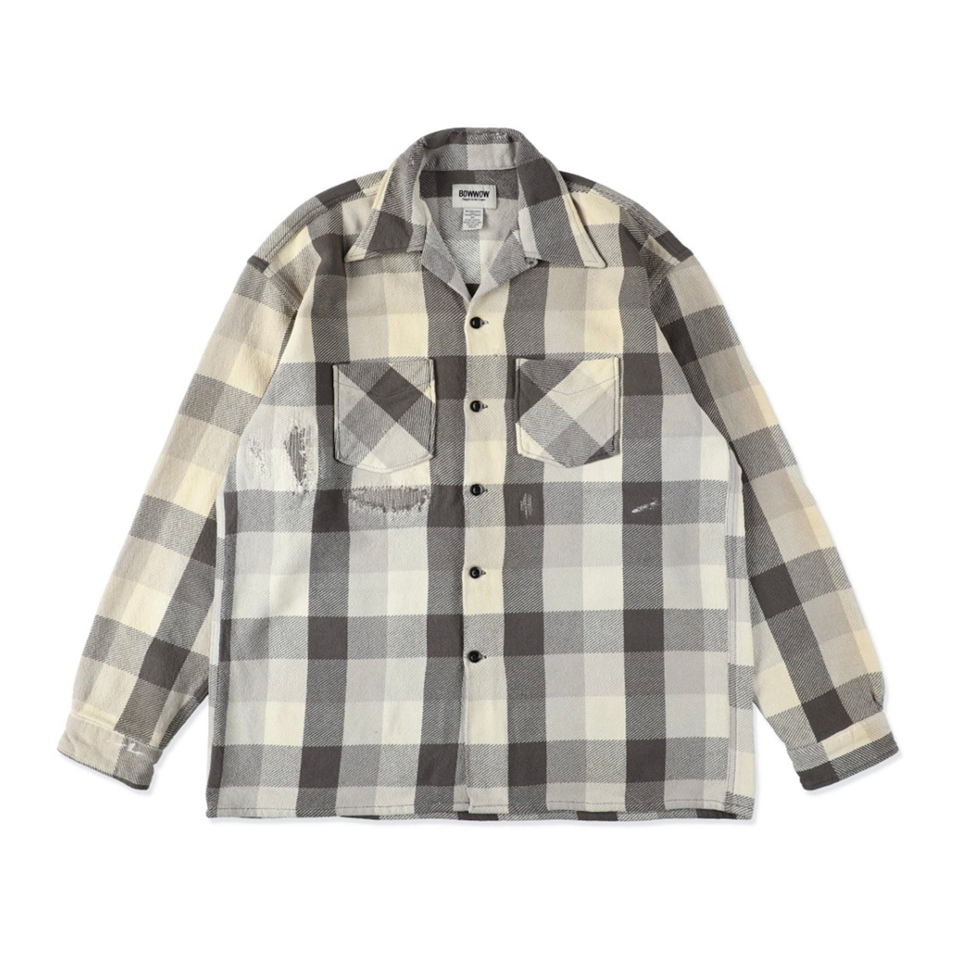 1940~50年代、限られた有名ワークブランドだけが製作した厚地チェックネルの開襟シャツ。本作は、その時代特有の重厚なチェックネルをグレー×ホワイトの配色で再現。