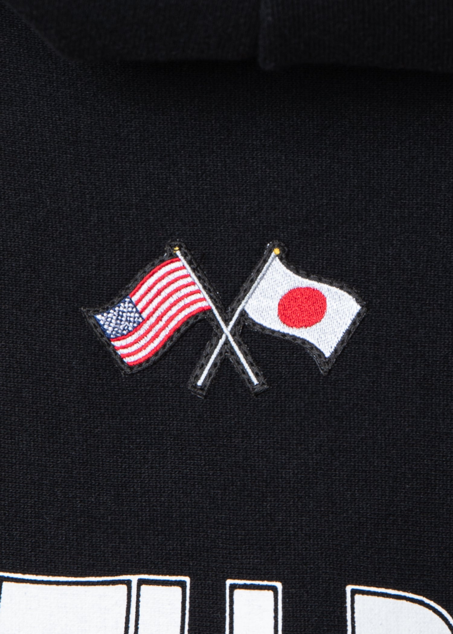 背面には、ロゴを大胆にプリントし、その上にはアメリカ国旗と日本国旗のワッペンを配置。