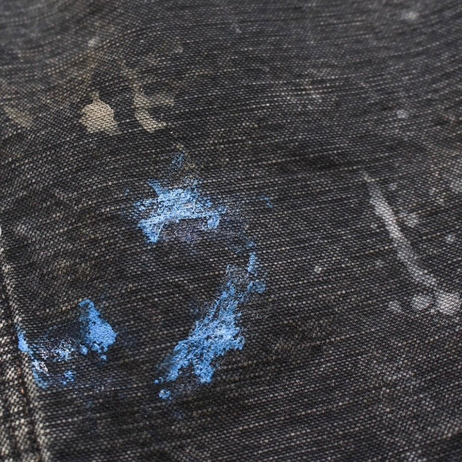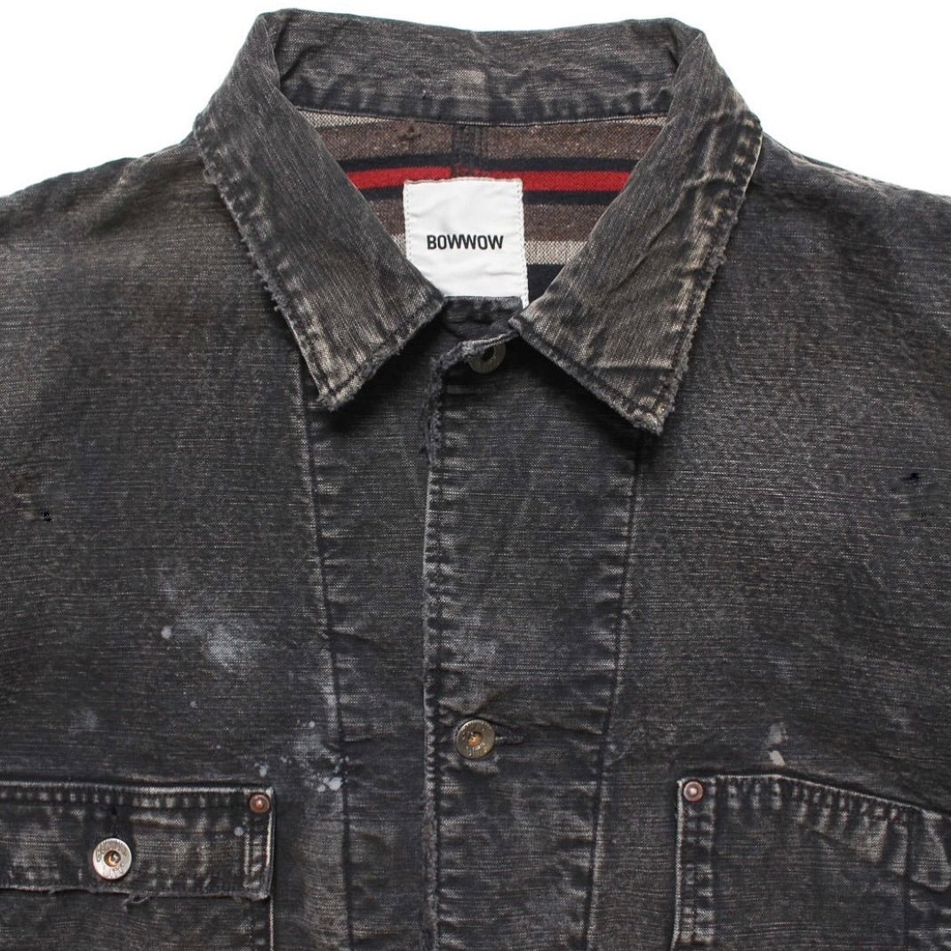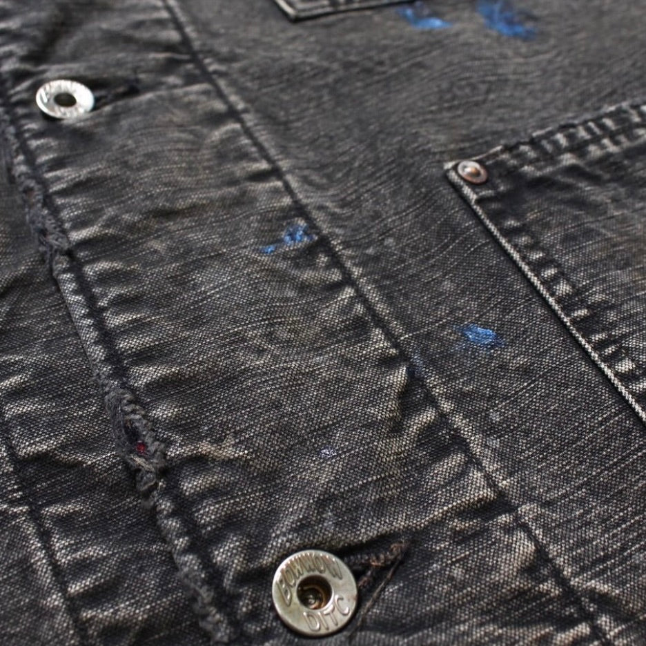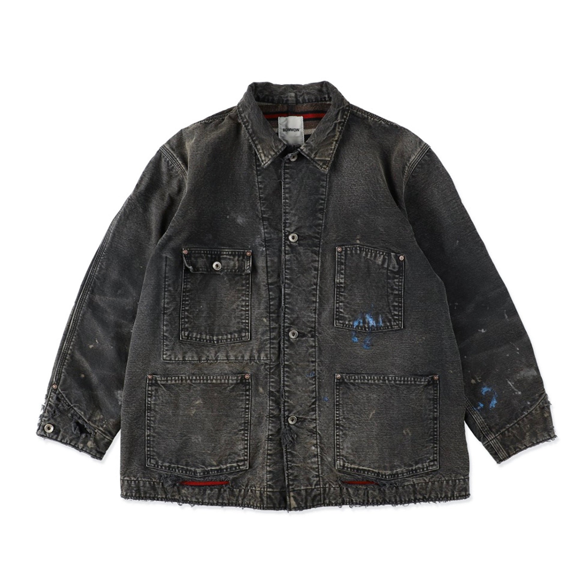 当時の空気感と完成されたワークウェアのクオリティを現代に落とし込んだ一着。身頃にはヘビーオンスのダック地を、裏地には温もりのブランケットを配し、日々の作業で知らぬ間に付いたペンキ跡や擦れ、味わい深い破れを加工で再現した。