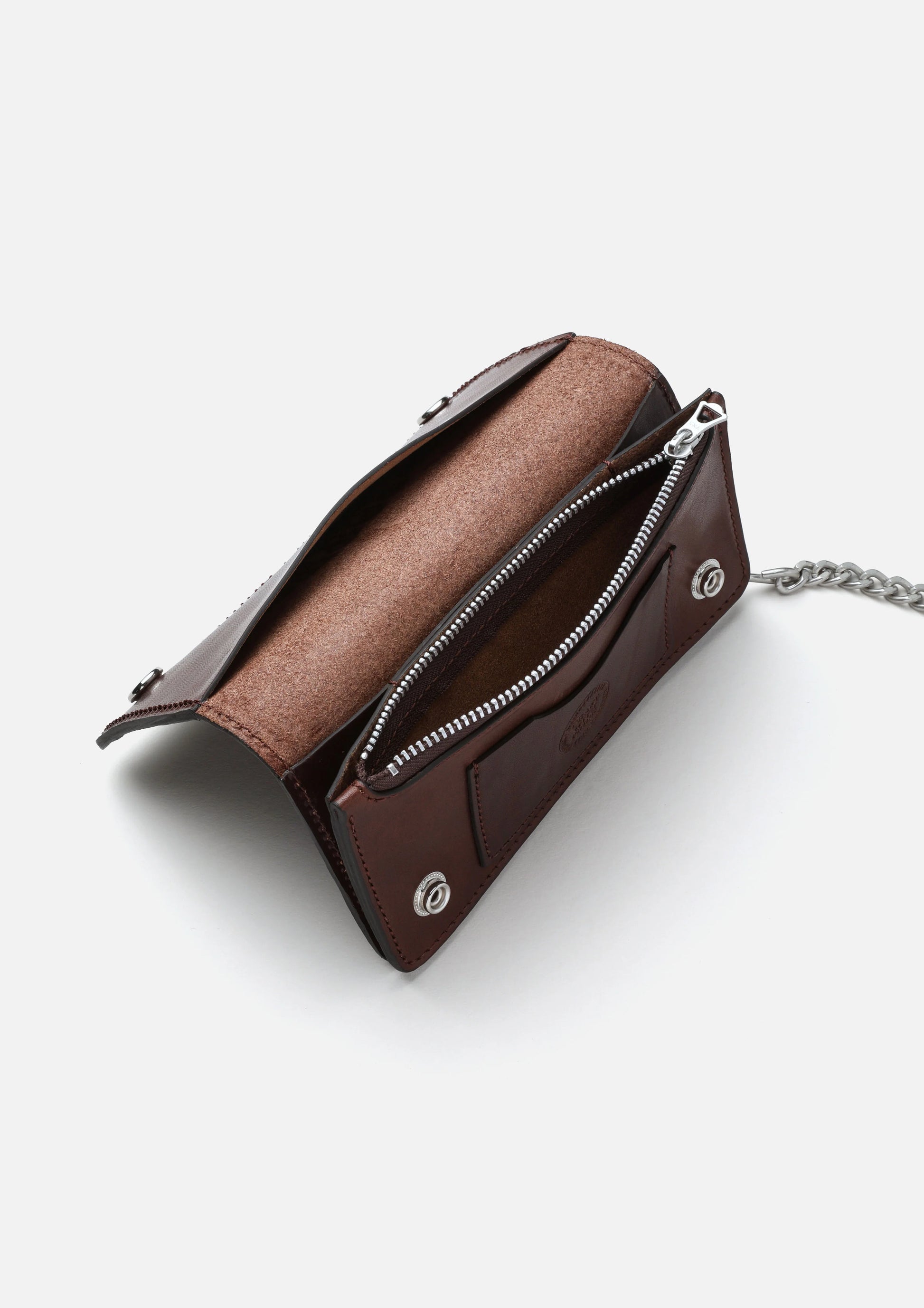 国産の上質なレザーを使用したレザーロングウォレット。ワックスを多量に含み、使用に伴い艶と色に深みが出る経年変化が特長。大容量の札入れやコインポケットを配備した優れた収納力。型押しロゴを配置。スチール製ウォレットチェーンを付属。