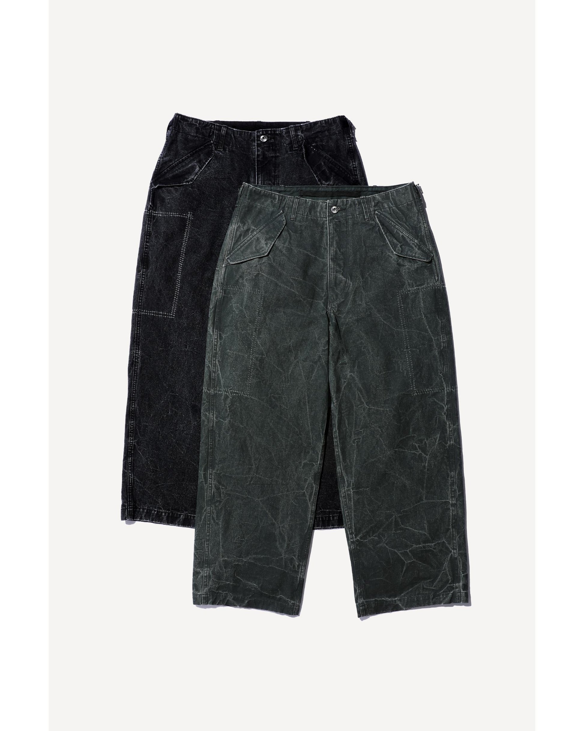 【デザイン】所有者によってサイドポケットが外されたM-51フィールドパンツをよりシンプルにアプデート。サイドポケットが外され、跡になったディテールを踏襲し、サスペンダーボタンやウエストテープも排除し、ワタリと膝幅を広げたボリュームのあるワイドテーパードシルエットにアレンジ。