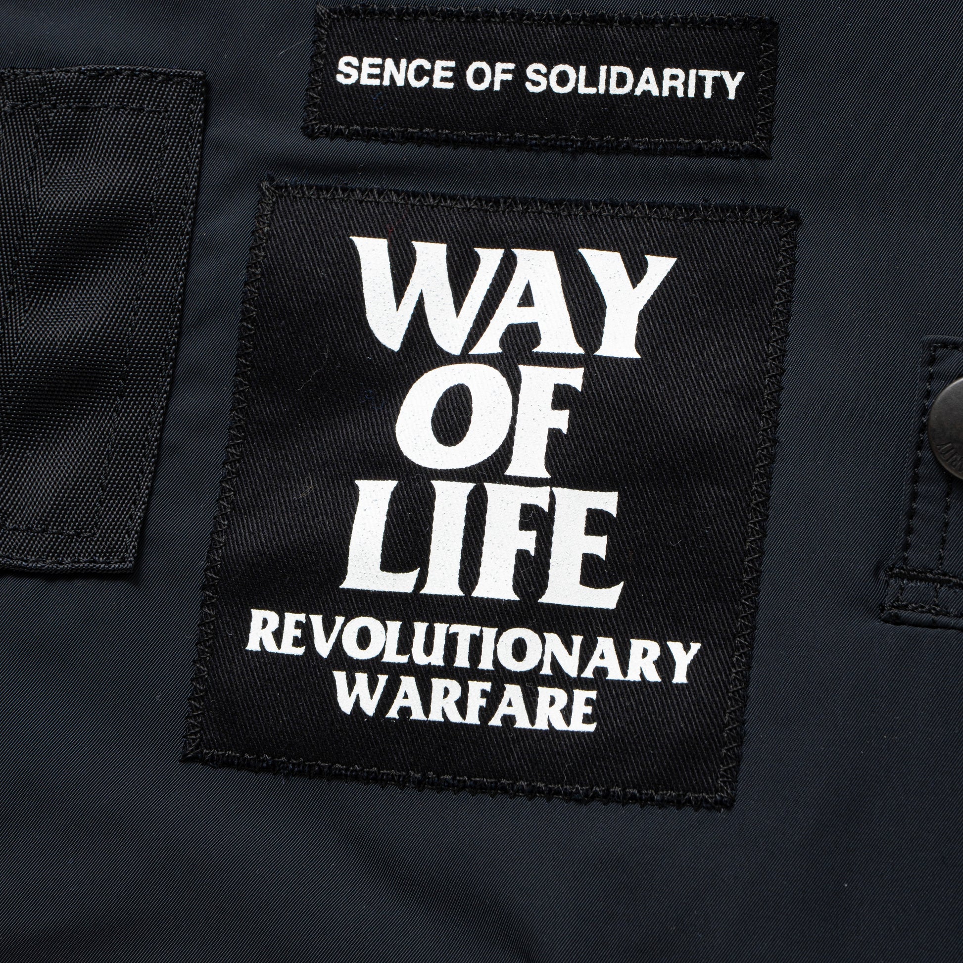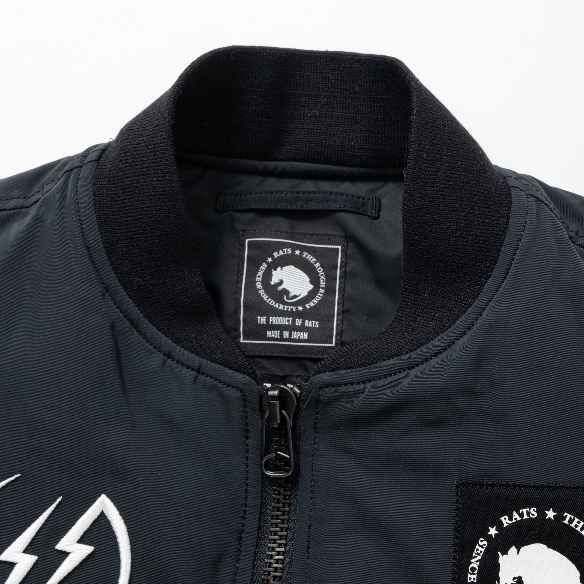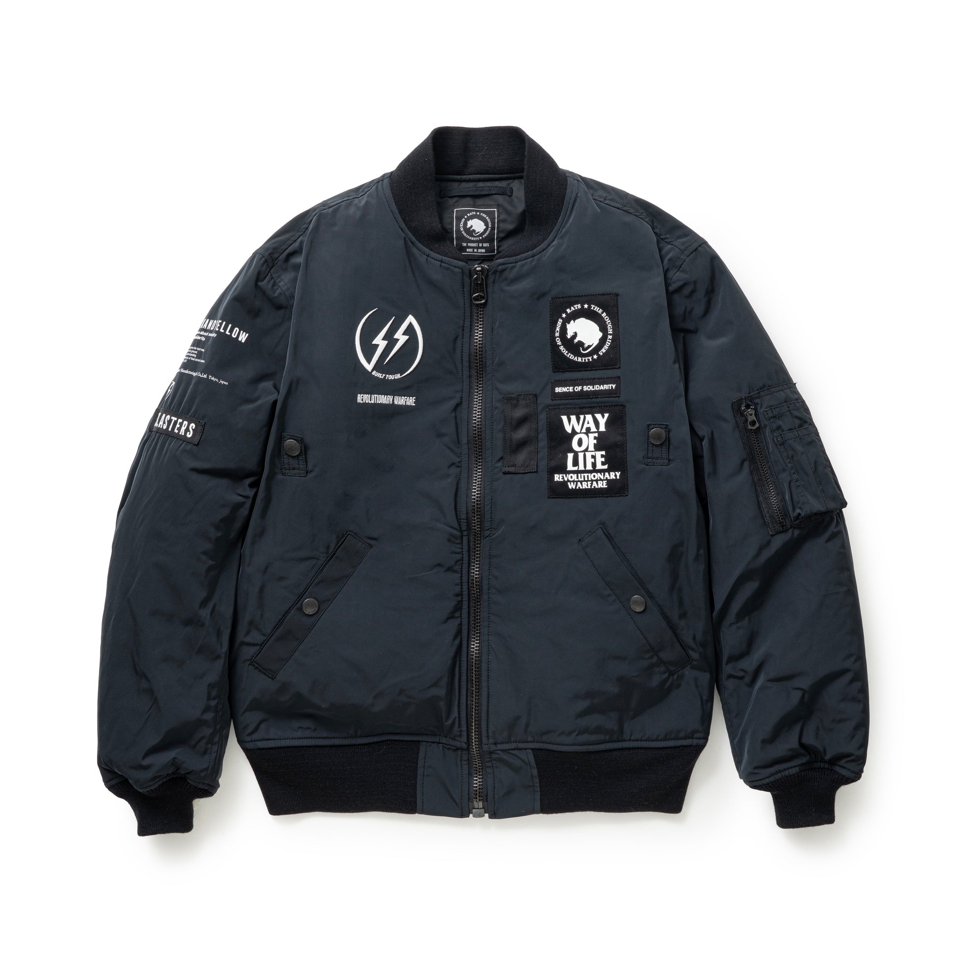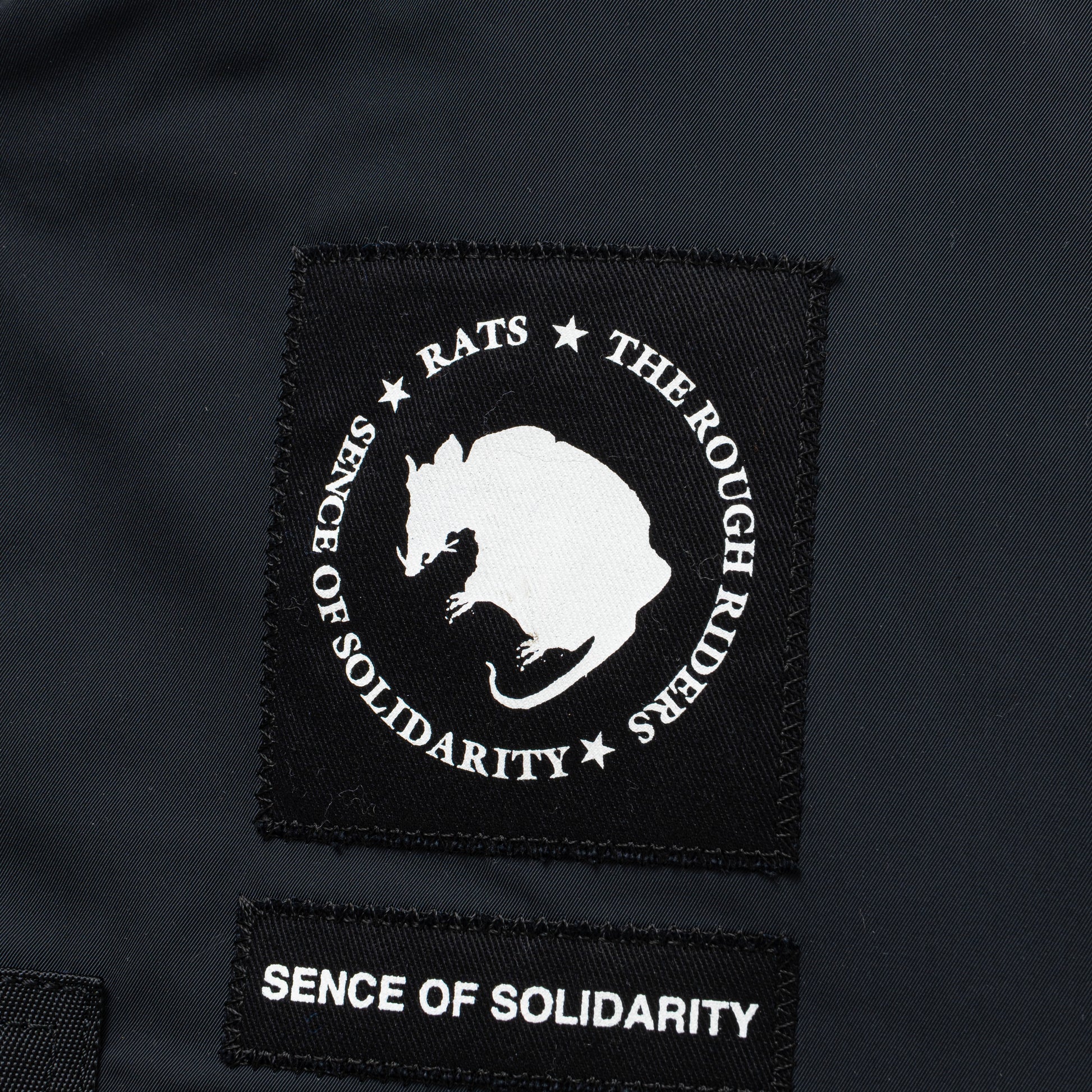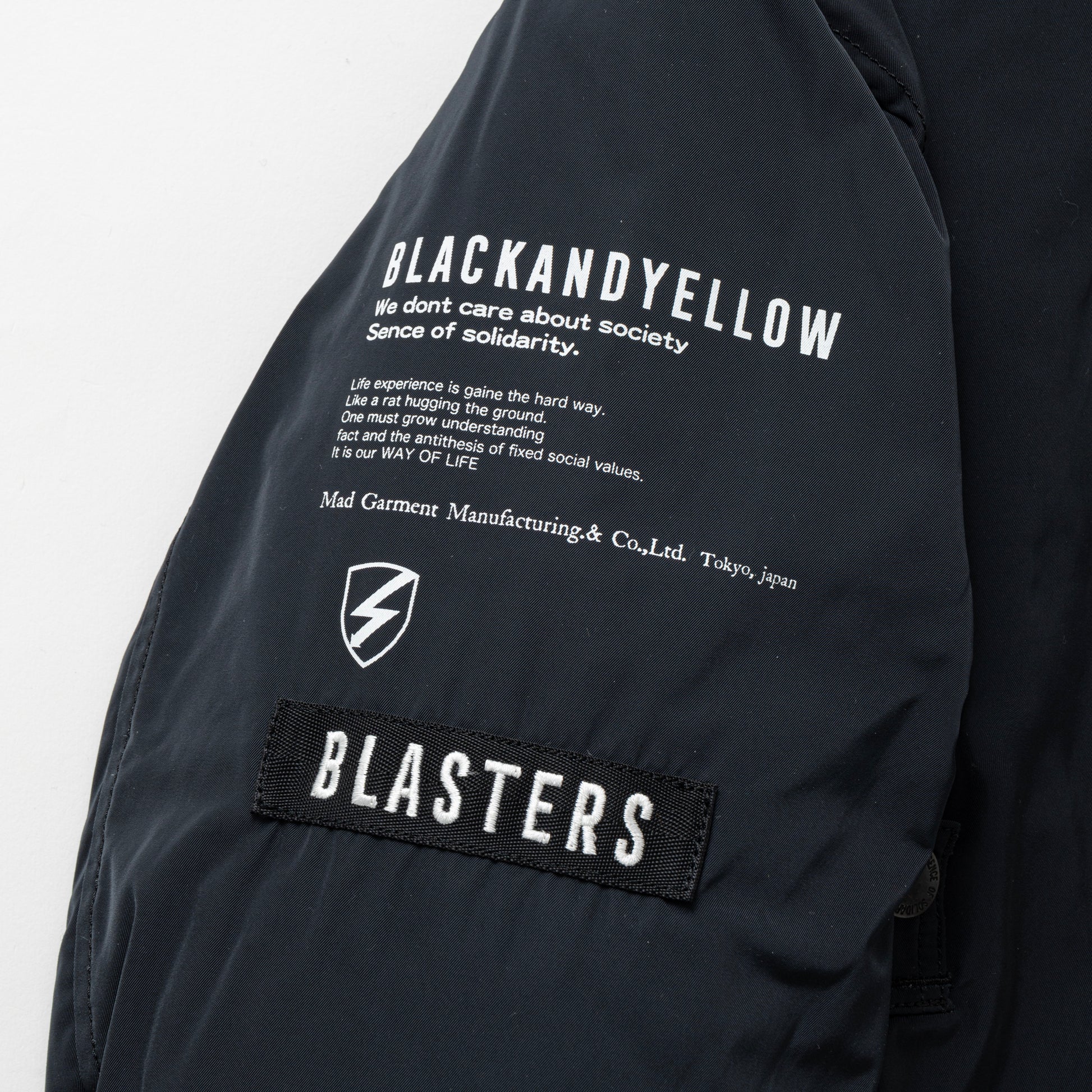 左胸にワッペン、右胸に3D刺繍、右肩にプリント・ナイロンテープをあしらった、高インパクトのデザイン。