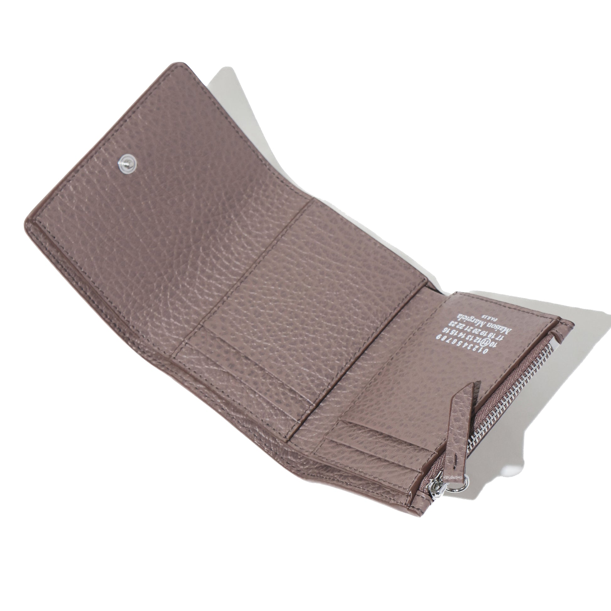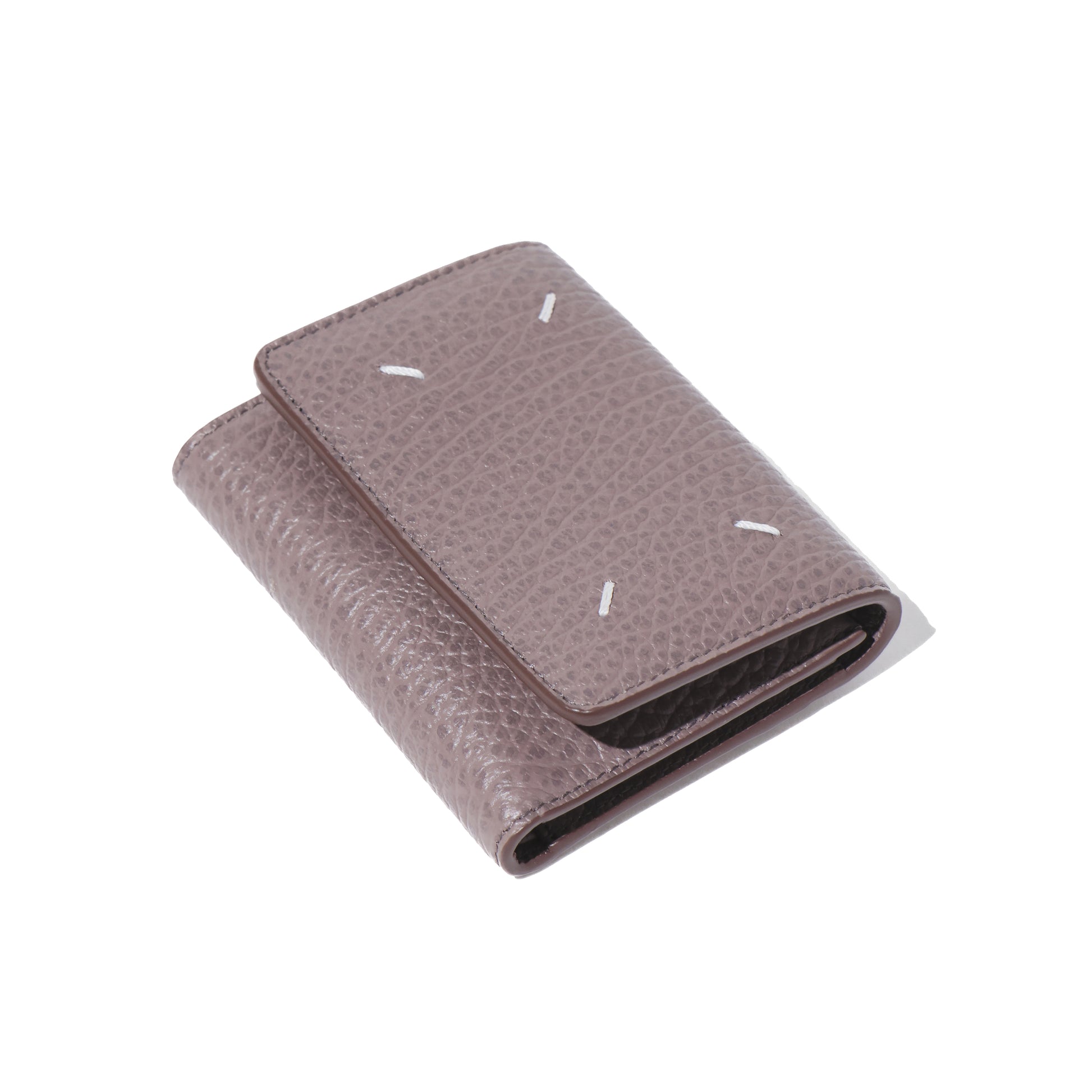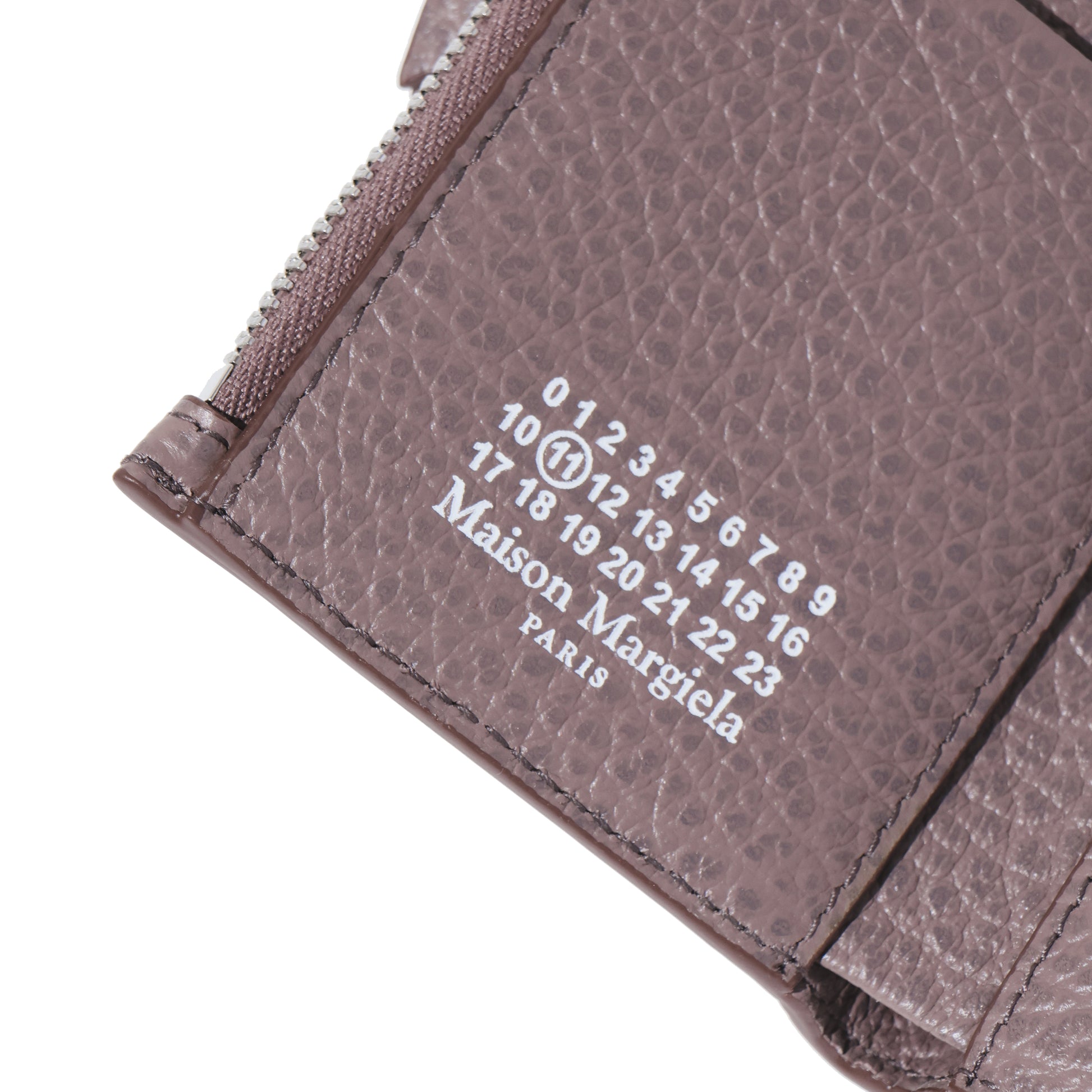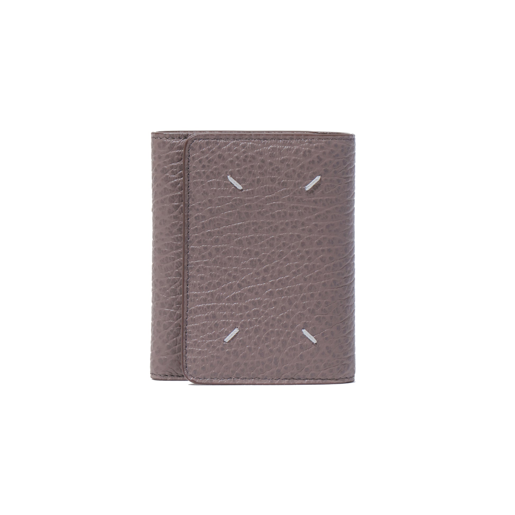 エンボス加工が施されたグレイニーレザー製のスリーフォールドウォレットです。内側には4つのカードホルダーとファスナー付きのセクションが備わっており、ナンバリングロゴが配されています。バックには、通常のファッションブランドのラベルとは対照的なメゾン マルジェラのシグネチャーの白い4ステッチがあしらわれています。
