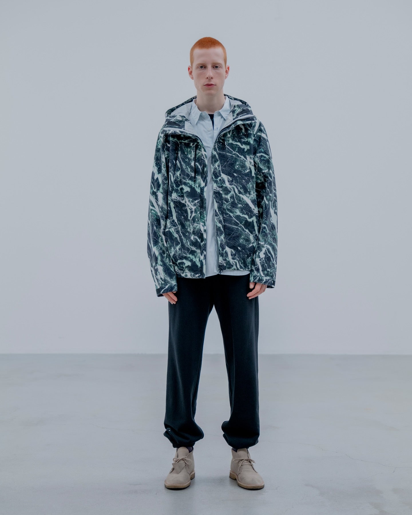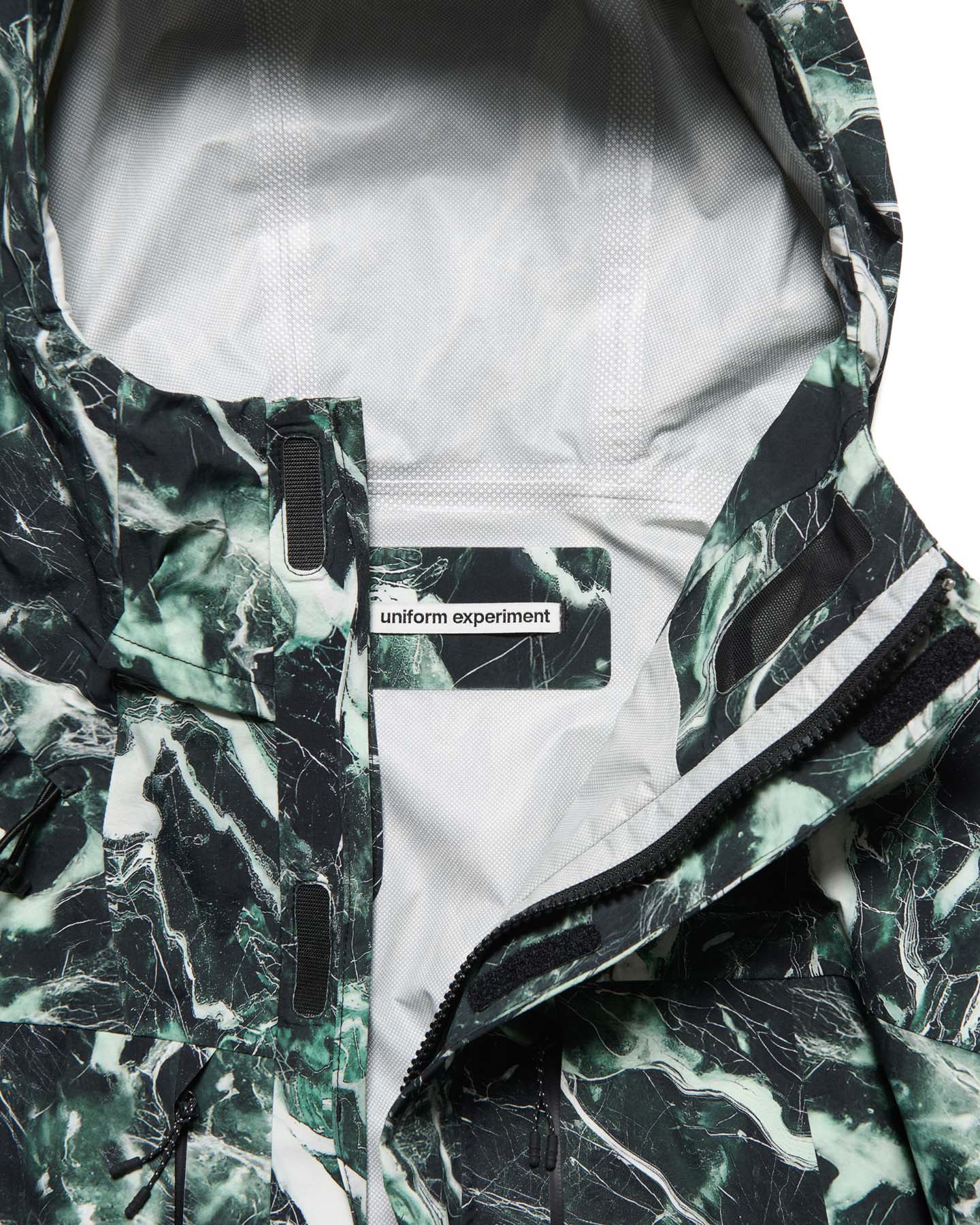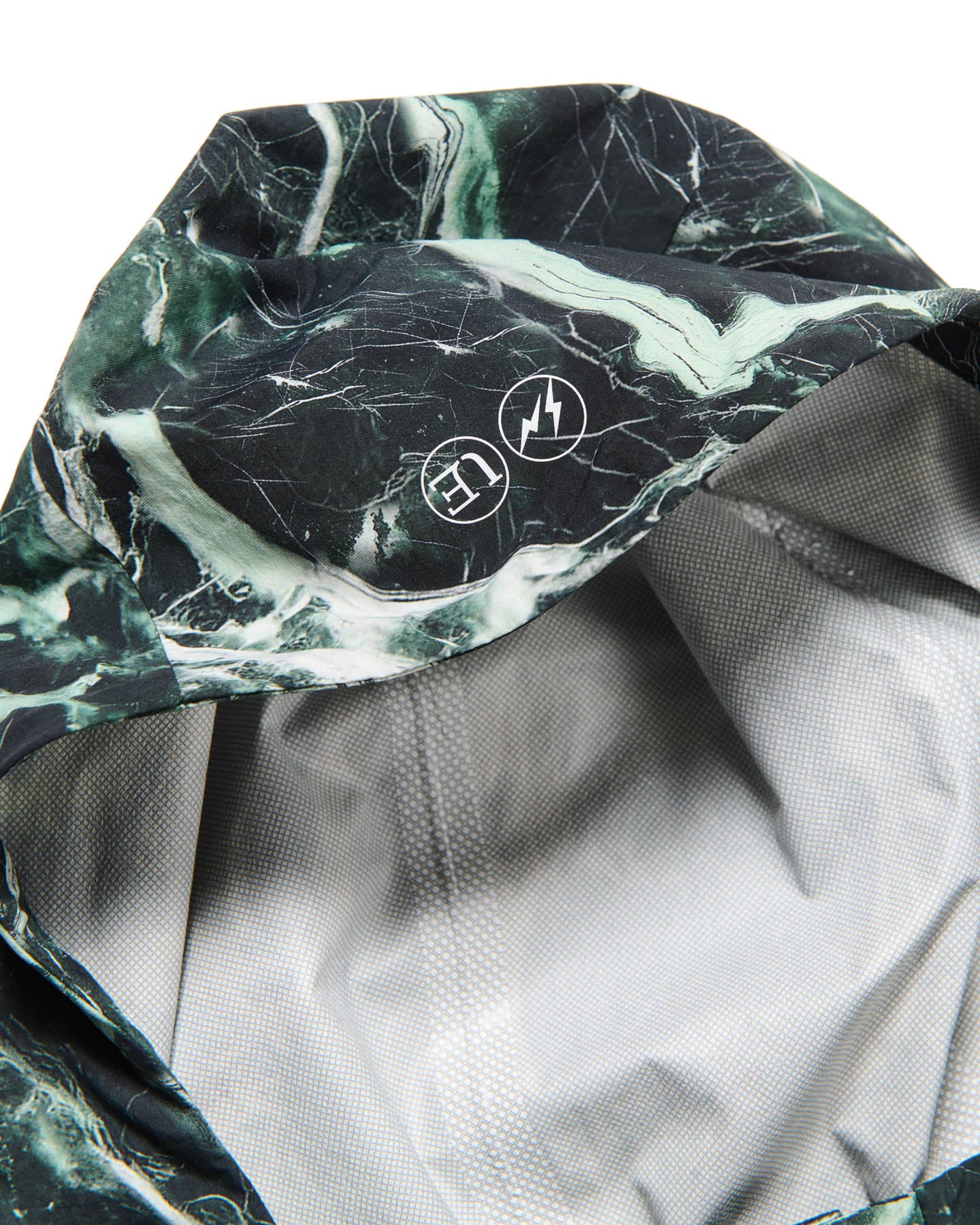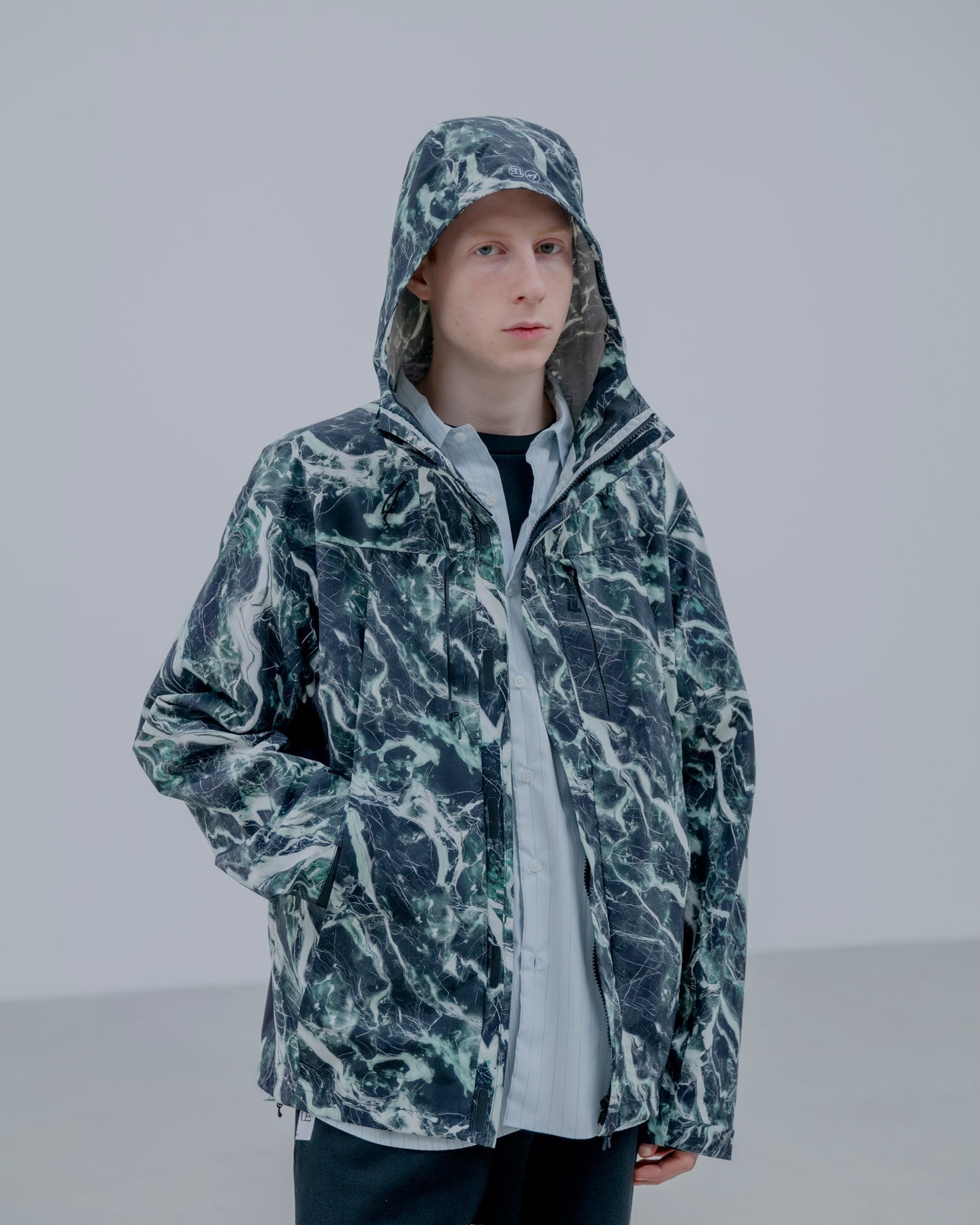 大理石=マーブル柄を、それぞれ防水透湿性に優れた2.5層のナイロンタフタに施したインパクトあふれるマウンテンパーカ。