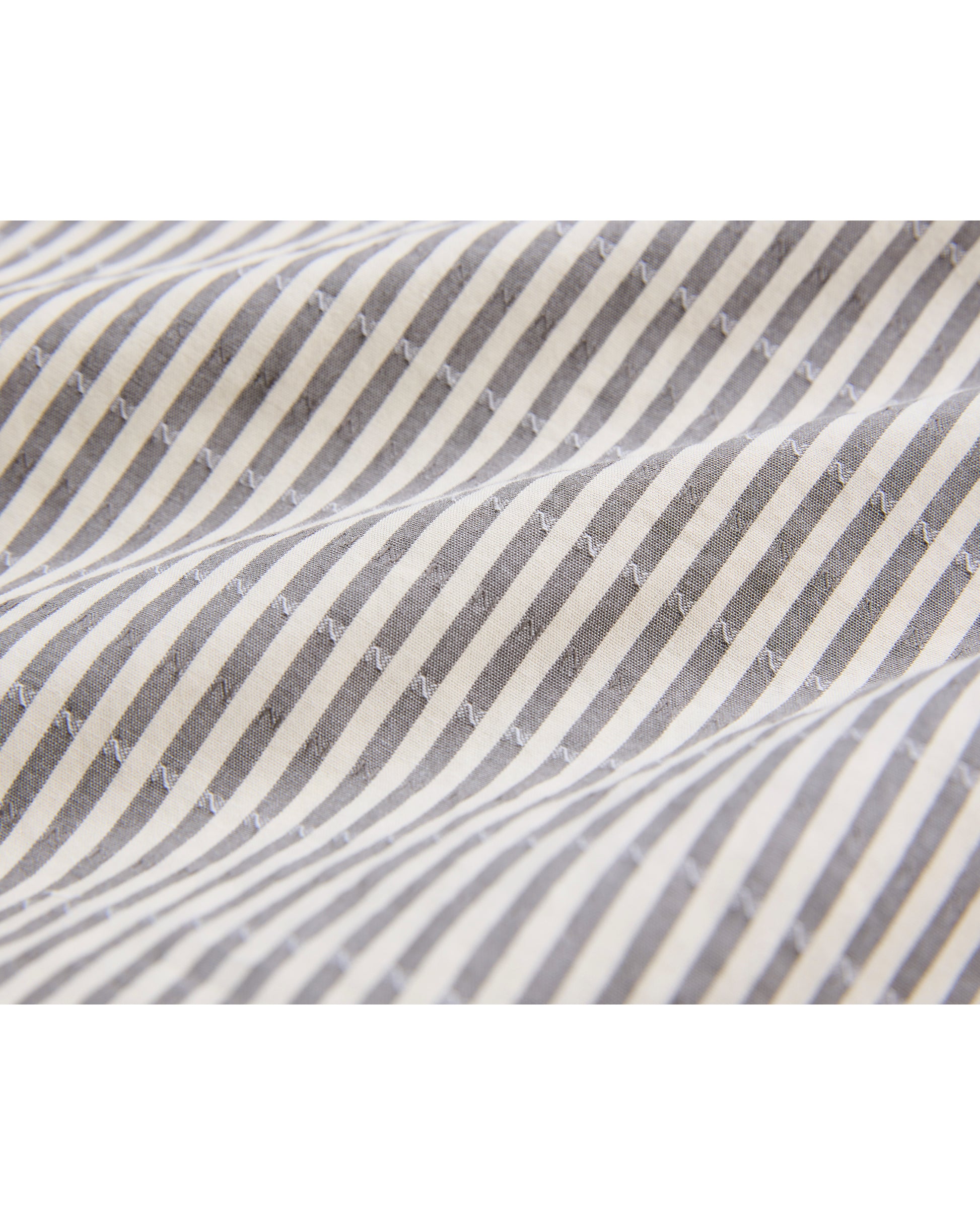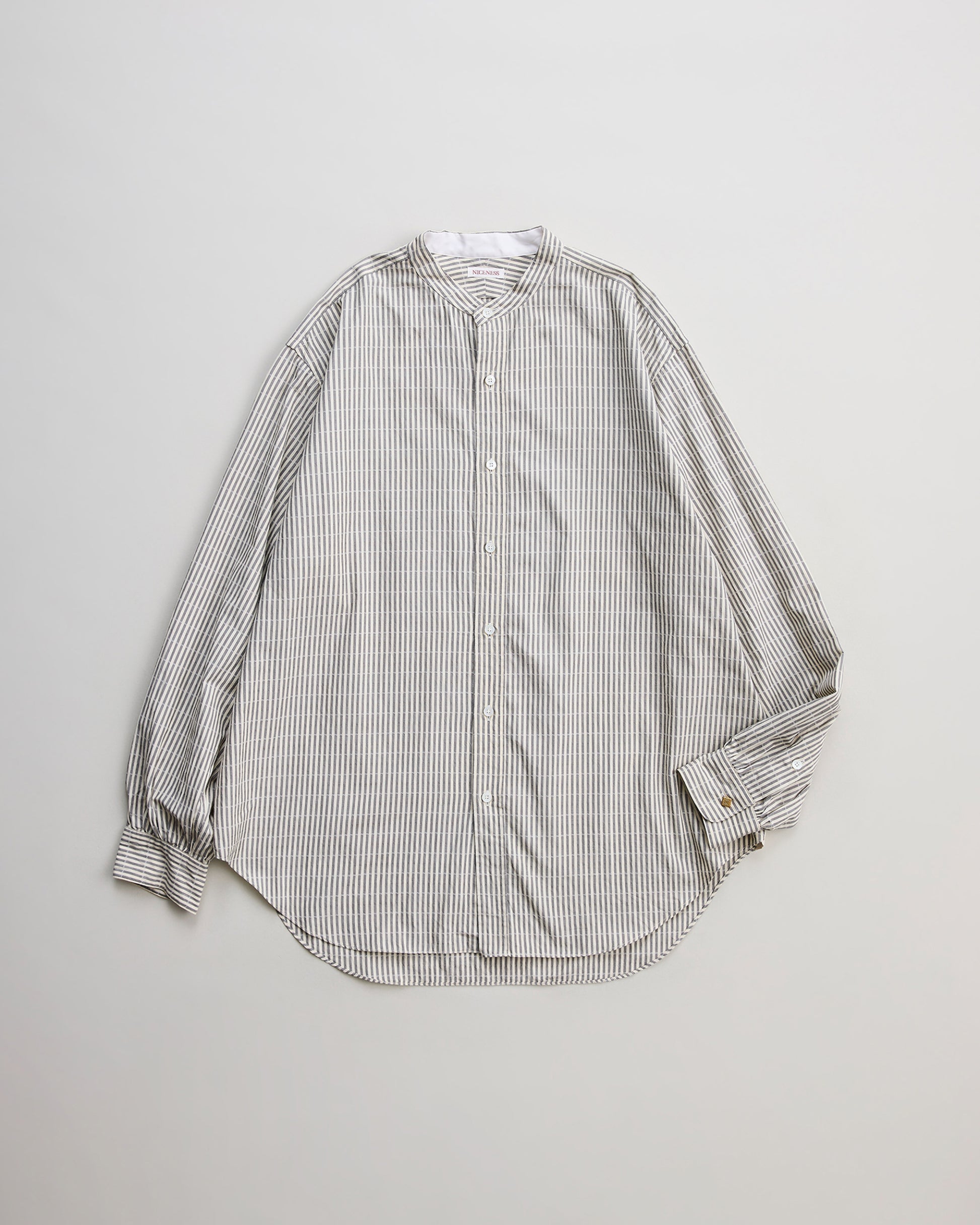 ドビー織機で「N」を表現した超長綿のブロードを使用したバンドカラーシャツ。高品質を誇る日本のドレスシャツ専業の縫製工場に依頼して製作。デザインは1970sのイギリスのシャツ型をベースに、袖や襟はフランスのドレスシャツの仕様を取り入れています。経年変化により油が抜けて少しカサついたシャリ感が出ているような生地感を目指し、特殊ワッシャー加工を施し洗いざらしのような風合いを表現しています。