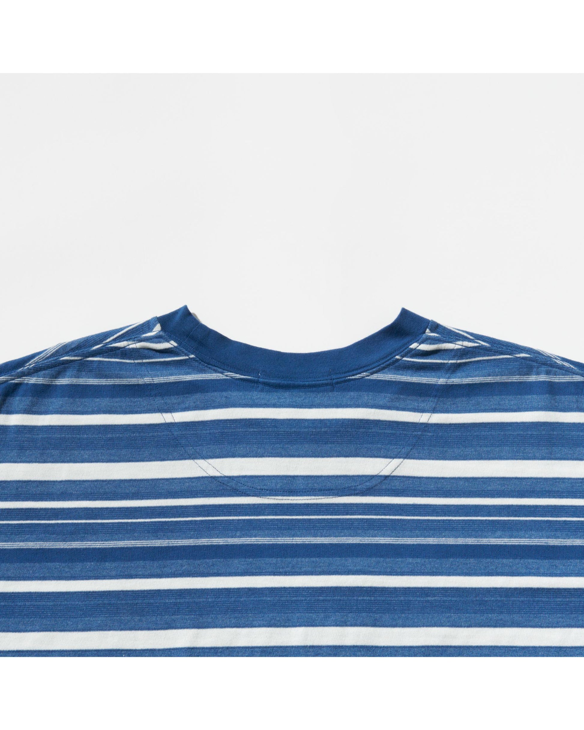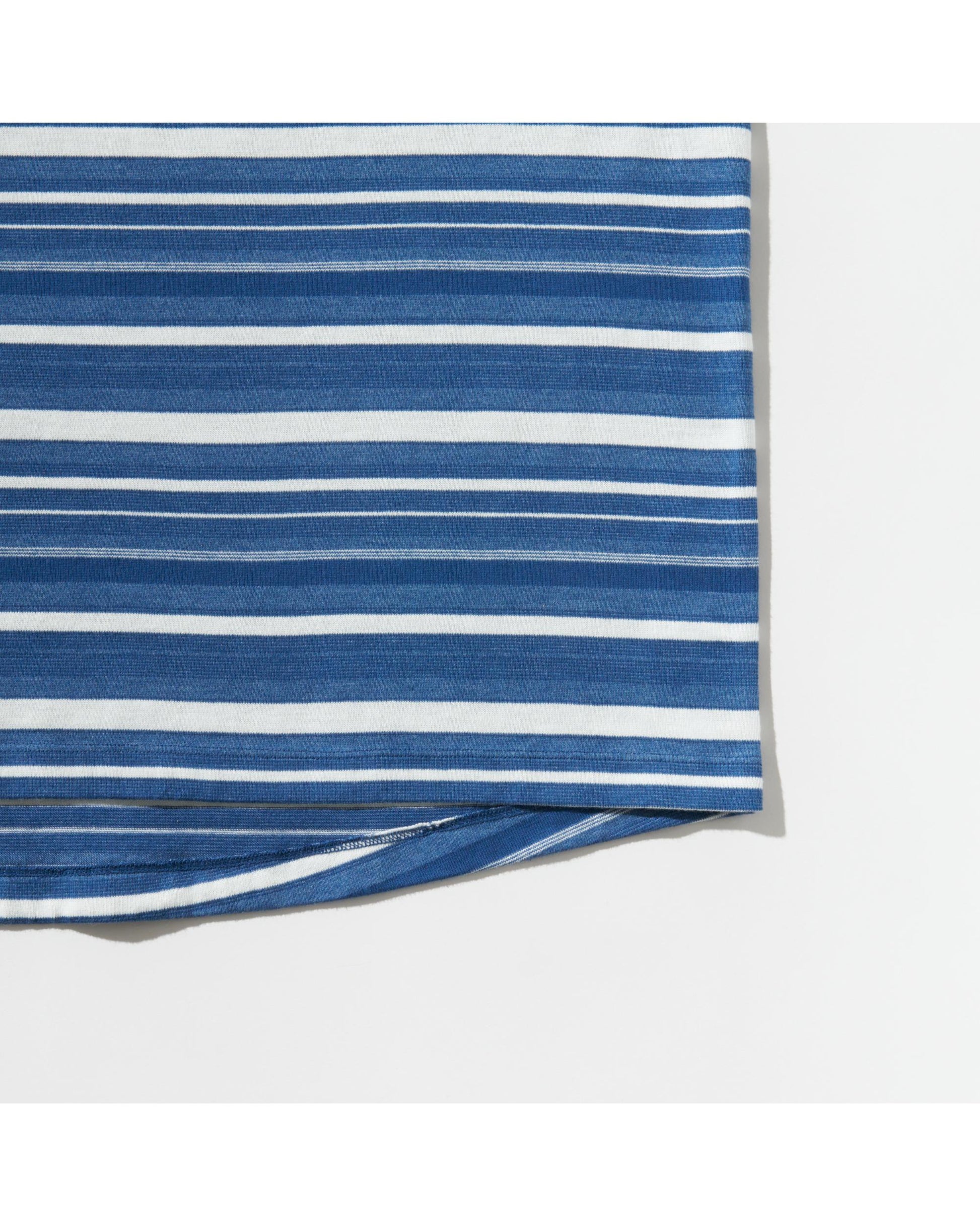 綿×ポリエステルの混紡糸、綿、ポリエステルの3種類の糸を組み合わせて構成したオリジナルのボーダー柄は、糸ごとに発色や色の濃淡に違いが現れ、単色の染料のみでマルチカラーボーダーのような奥行きのある表情が生まれています。