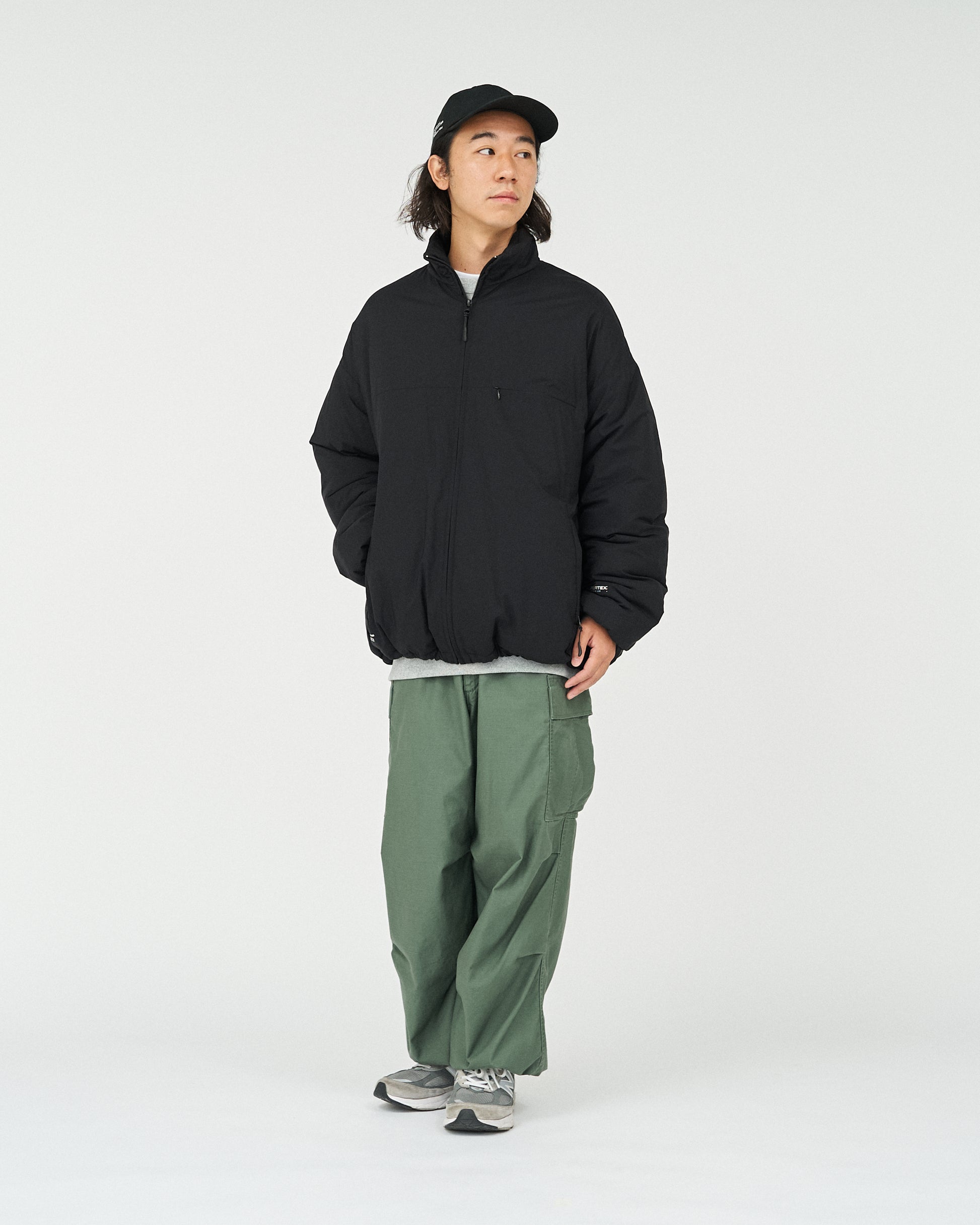 PERTEX® QUANTUM のミニリップストップ生地を使用したジップアップスタンドカラーブルゾン。防風性、通気性、軽量性を兼ね備えた機能的な一着。中綿を搭載しており、軽さを保ちながらもしっかりとした保温性を提供。