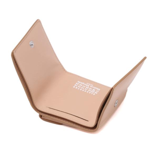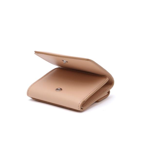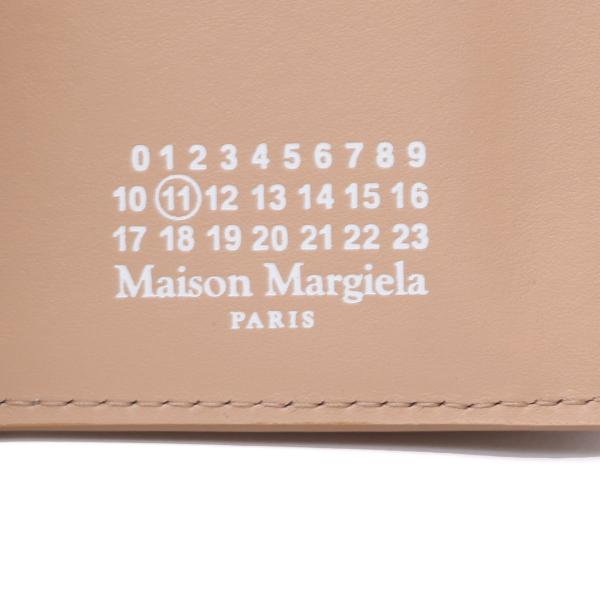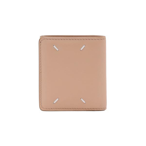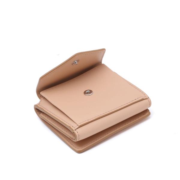 やや光沢のあるソフトカーフレザー製の二つ折りウォレットです。スナップボタン開閉式。エンベロープスタイルのコインポケット1つ、カードスロット4つ、紙幣入れ1つを備えています。内側にメゾンのナンバーロゴ、外側に4本ステッチがあしらわれています。