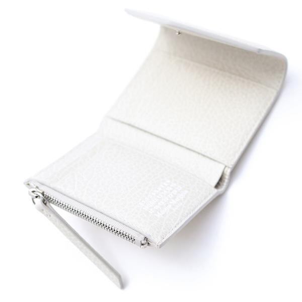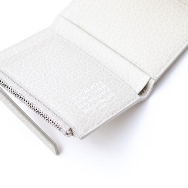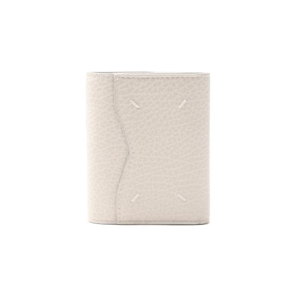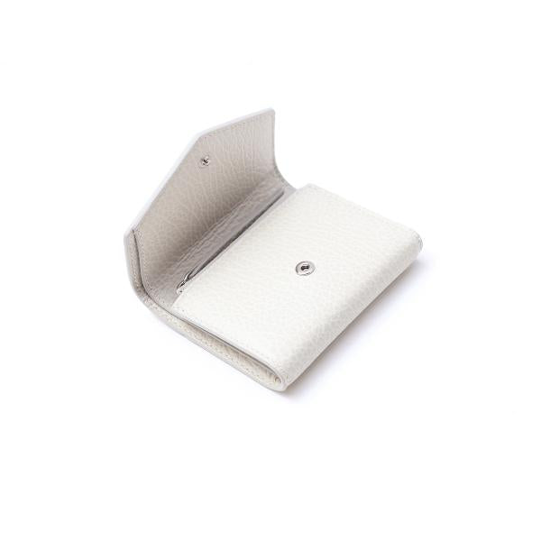 三つ折りのエンベロープウォレットです。エンボス加工を施したグレインレザー製で、ラップアラウンドデザインです。 内側はいくつかのスペースに区切られ、ファスナー付きコインパースがついております。
