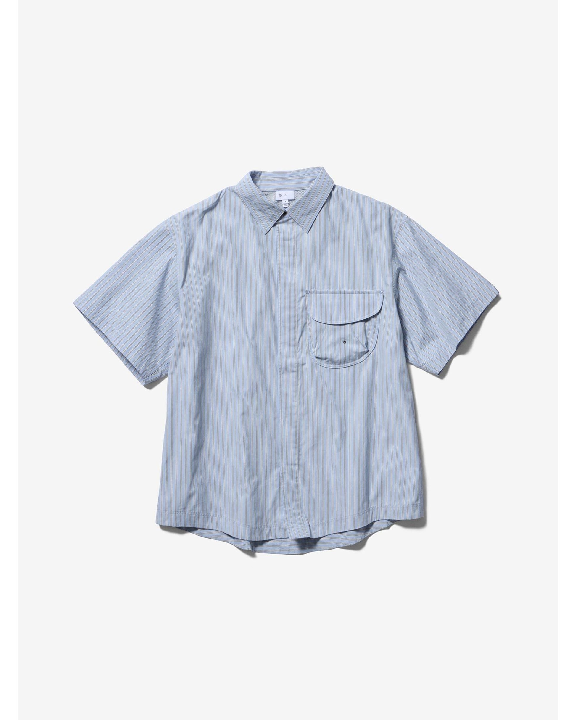 クラシックなストライプ柄の中に再帰反射糸を織り込んだ、オリジナルの生地で仕立てたショートスリーブシャツ。左胸のオーガニックシェイプのポケットには、出し入れできるメッシュポケットが取り付けられている。