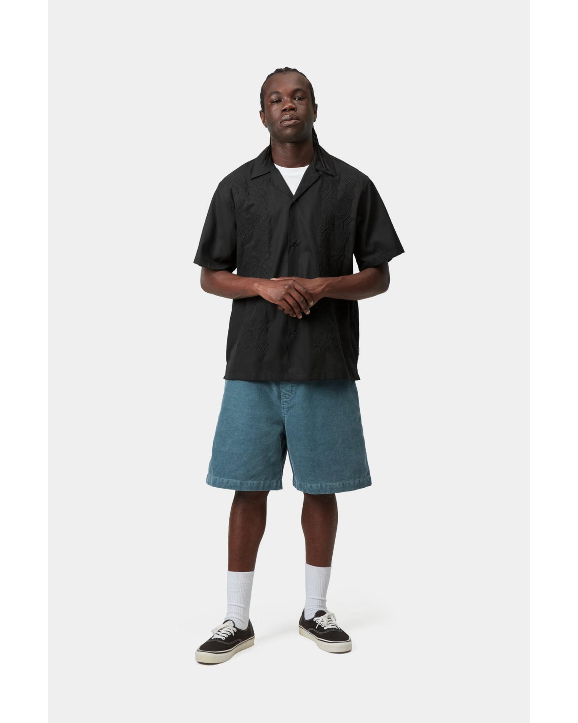 ボタンフロントとキャンプカラー仕様で、フロントにはグラフィック刺繍が施されています。