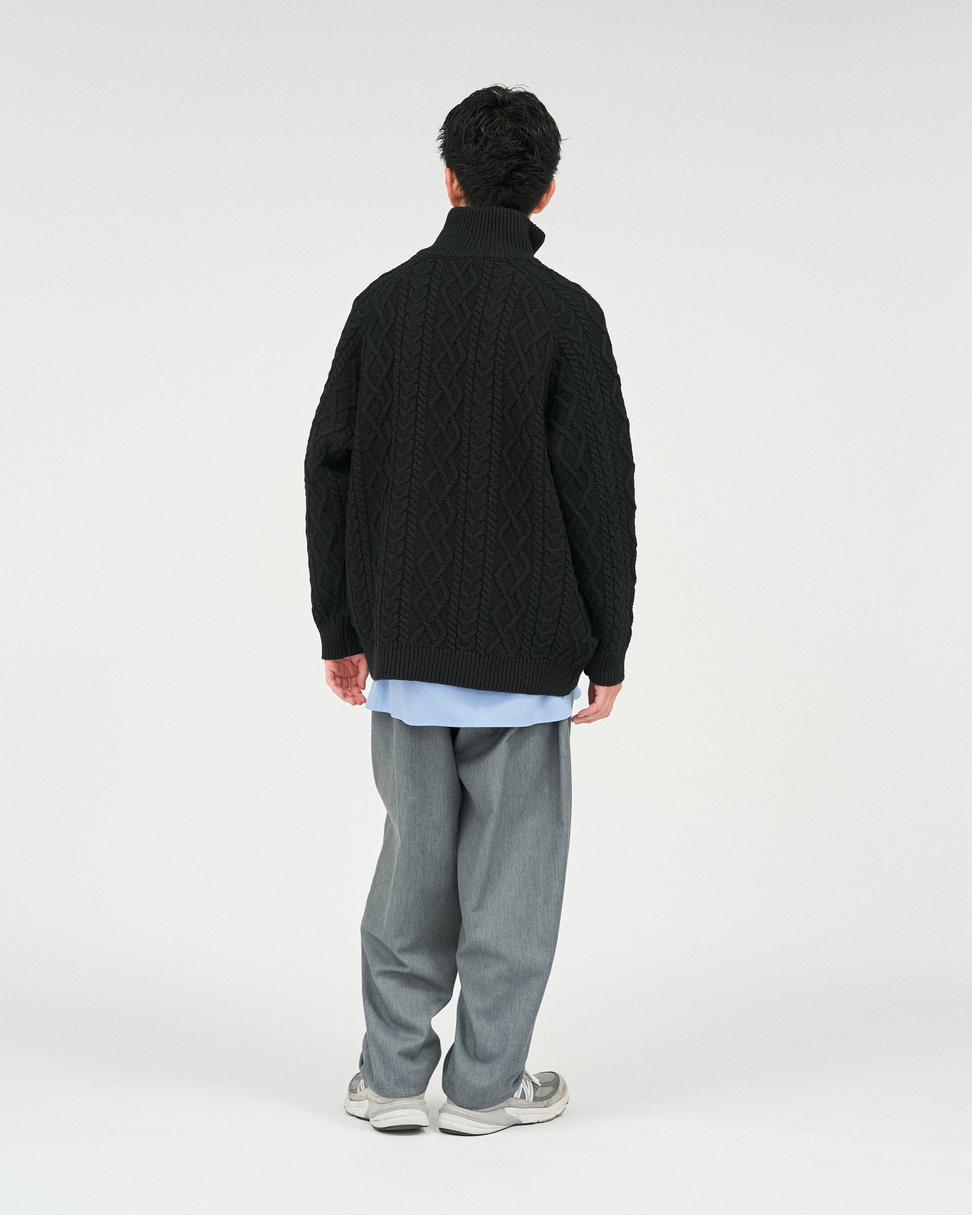 伝統的なアラン編のフィッシャーマンセーターを現代的にアップデート。伸縮性や形態安定性に優れたSOLOTEX糸にシェットランドウールをカバーリングしたハイブリットな一着。