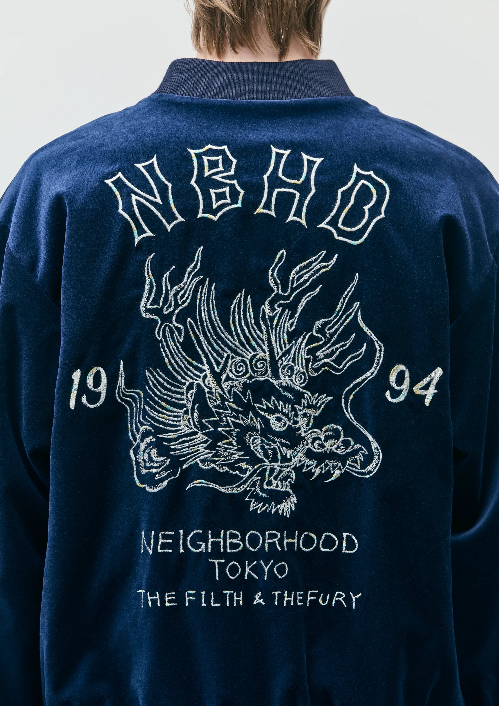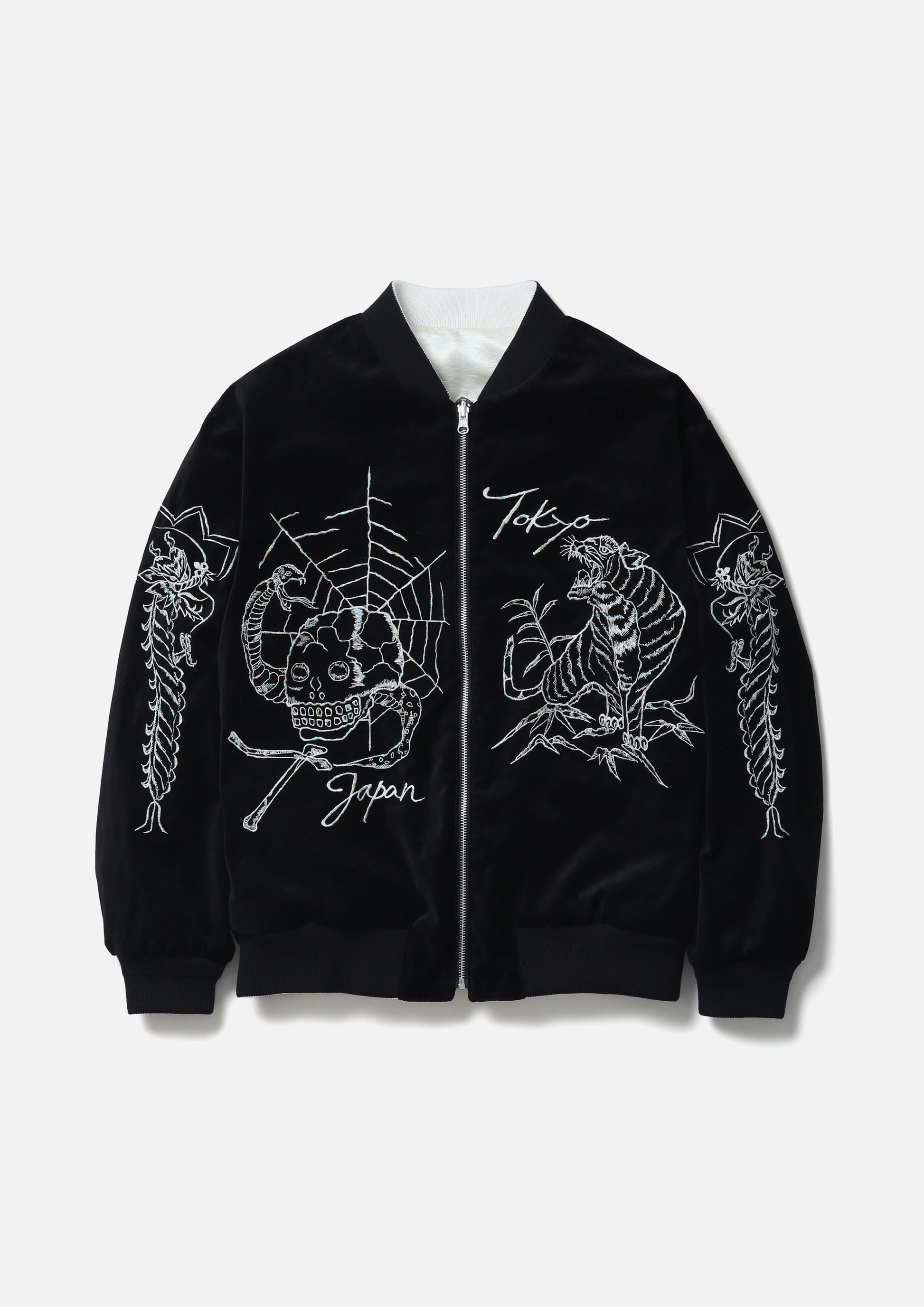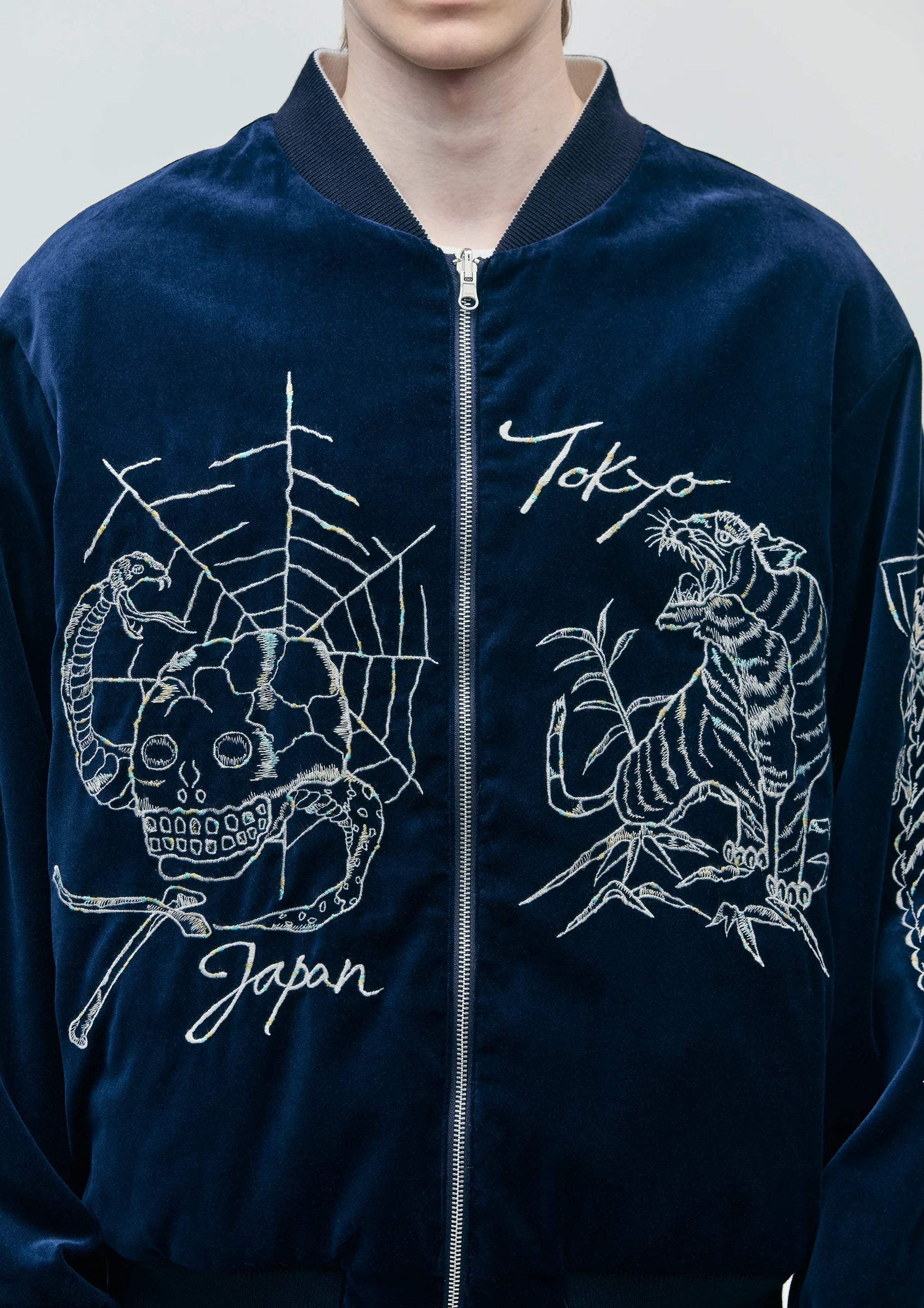 表面に別珍生地、裏面にはヴィンテージライクなシワ感と光沢のあるサテン生地を使用したスーベニアジャケット。表裏に虎やスカル、トランプなどのヴィンテージモチーフを刺繍したリバーシブル仕様。表裏で異なる仕様のポケットを配置。サイドシームにピスネームを付属。