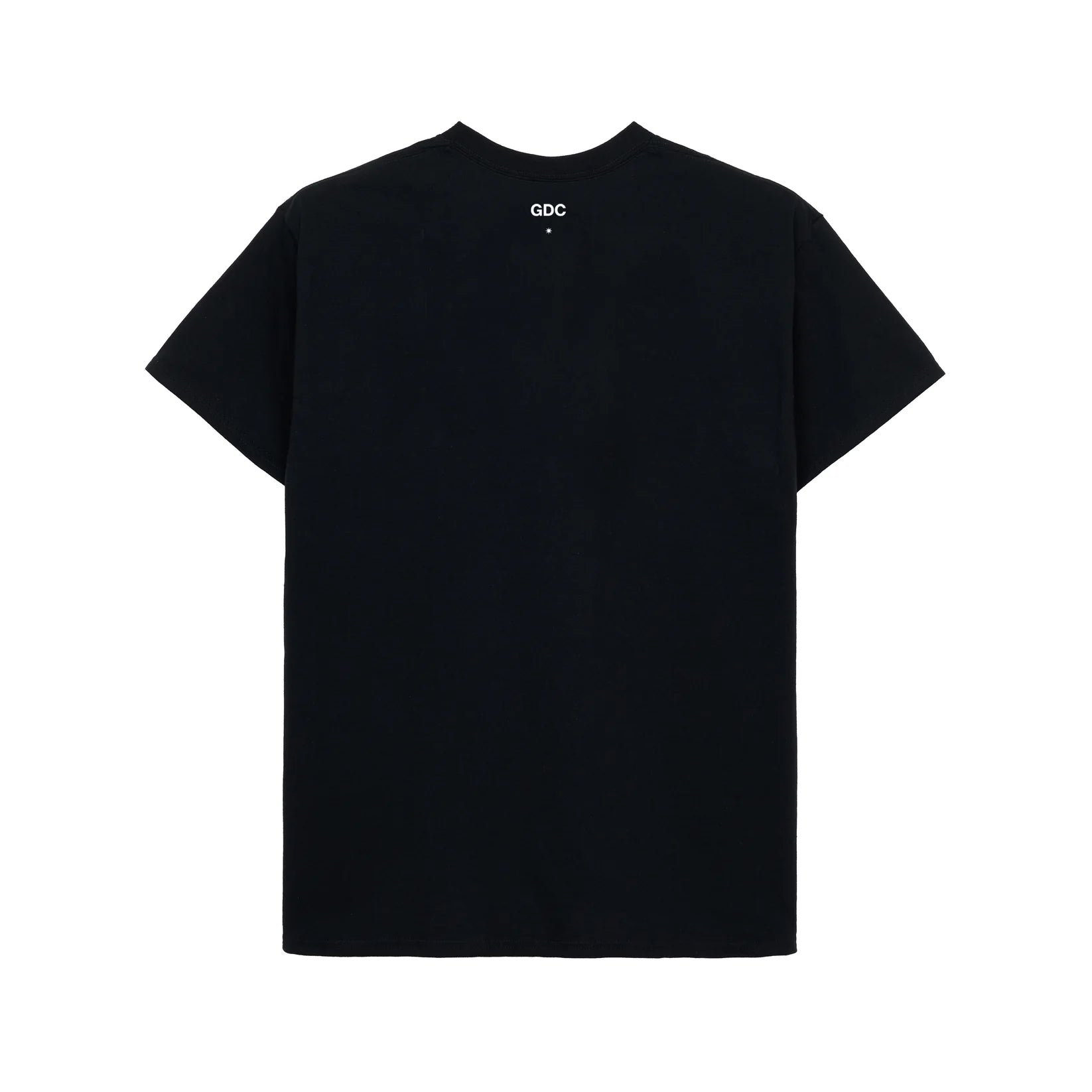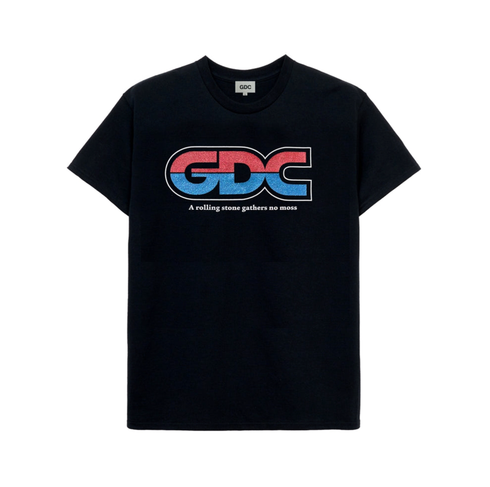 ロゴの下には “a rolling stone gathers no moss(転石苔むさず)” のレターグラフィックをラバープリントで表現しています。背面の襟下にはGDCロゴと8芒星STAモチーフをさりげなくオン。